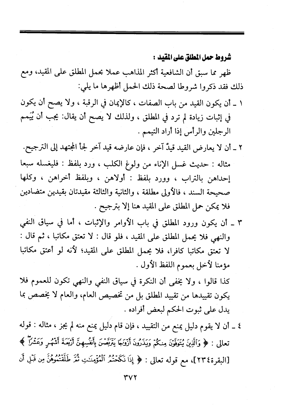 4 - أن لا يقوم دليل يمنع من التقييد، فإن قام دليل يمنع منه لم يجز، مثاله: قوله تعالى: {وَالَّذِينَ يُتَوَفَّوْنَ مِنْكُمْ وَيَذَرُونَ أَزْوَاجًا يَتَرَبَّصْنَ بِأَنْفُسِهِنَّ أَرْبَعَةَ أَشْهُرٍ وَعَشْرًا} [البقرة234]، مع قوله تعالى: {إِذَا نَكَحْتُمُ الْمُؤْمِنَاتِ ثُمَّ طَلَّقْتُمُوهُنَّ مِنْ قَبْلِ أَنْ