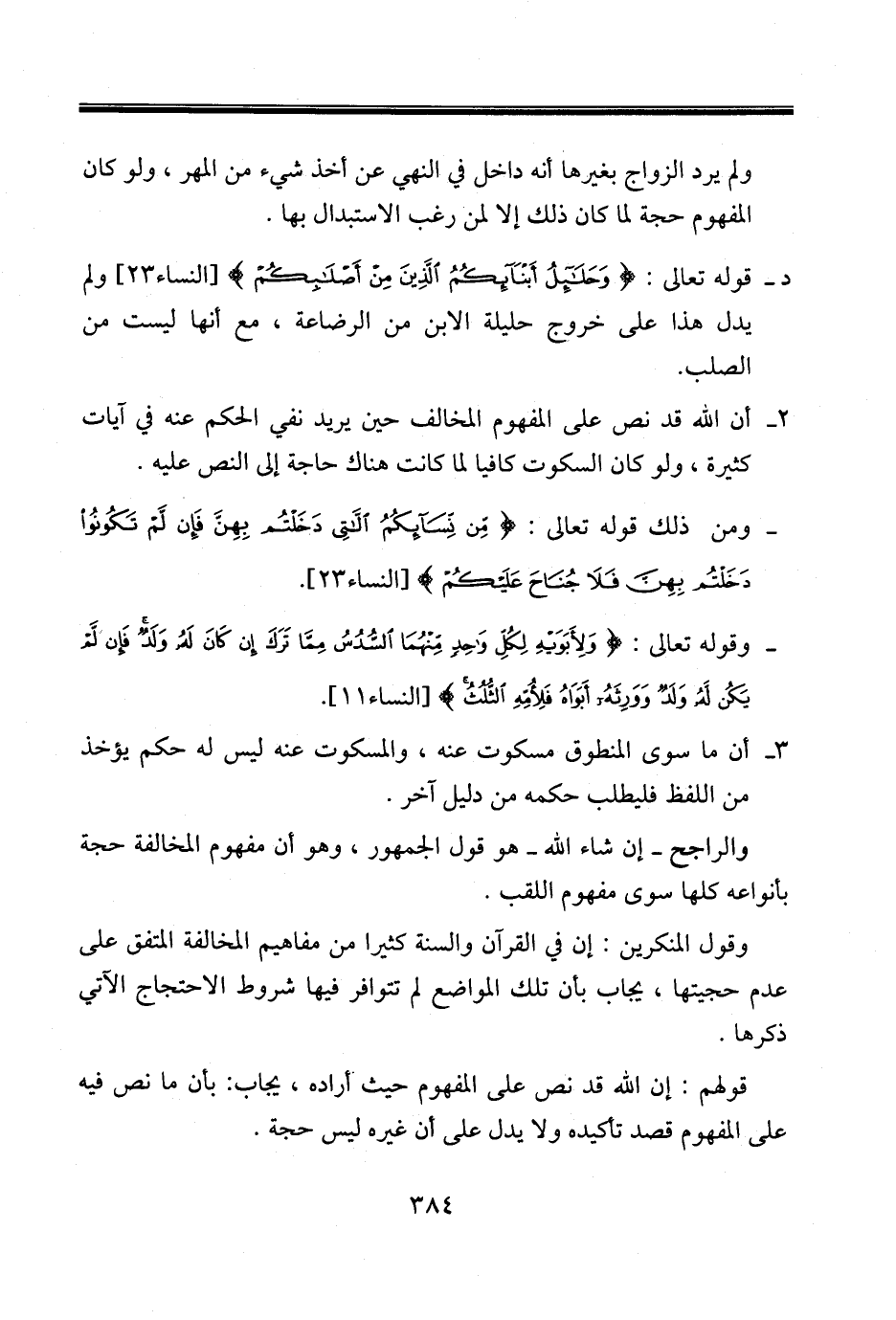 د ـ ... قوله تعالى: {وَحَلَائِلُ أَبْنَائِكُمُ الَّذِينَ مِنْ أَصْلَابِكُمْ} [النساء23] ولم يدل هذا على خروج حليلة الابن من الرضاعة، مع أنها ليست من الصلب.