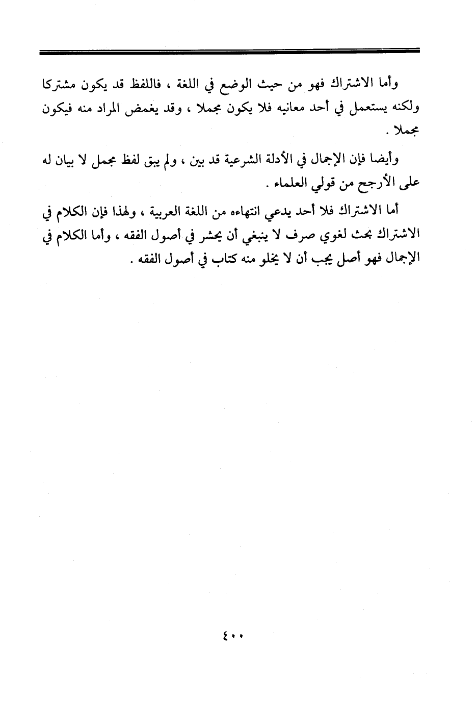 أما الاشتراك فلا أحد يدعي انتهاءه من اللغة العربية، ولهذا فإن الكلام في الاشتراك بحث لغوي صرف لا ينبغي أن يحشر في أصول الفقه، وأما الكلام في الإجمال فهو أصل يجب أن لا يخلو منه كتاب في أصول الفقه.