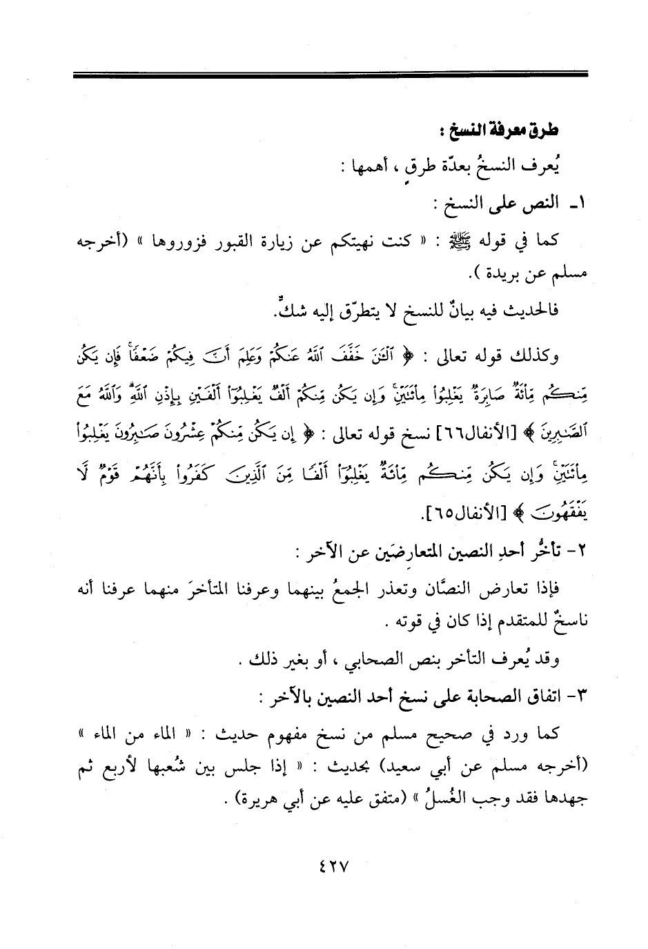 وكذلك قوله تعالى: {الْآنَ خَفَّفَ اللَّهُ عَنْكُمْ وَعَلِمَ أَنَّ فِيكُمْ ضَعْفًا فَإِنْ يَكُنْ مِنْكُمْ مِائَةٌ صَابِرَةٌ يَغْلِبُوا مِائَتَيْنِ وَإِنْ يَكُنْ مِنْكُمْ أَلْفٌ يَغْلِبُوا أَلْفَيْنِ بِإِذْنِ اللَّهِ وَاللَّهُ مَعَ الصَّابِرِينَ} [الأنفال66] نسخ قوله تعالى: {إِنْ يَكُنْ مِنْكُمْ عِشْرُونَ صَابِرُونَ يَغْلِبُوا مِائَتَيْنِ وَإِنْ يَكُنْ مِنْكُمْ مِائَةٌ يَغْلِبُوا أَلْفًا مِنَ الَّذِينَ كَفَرُوا بِأَنَّهُمْ قَوْمٌ لَا يَفْقَهُونَ} [الأنفال65].