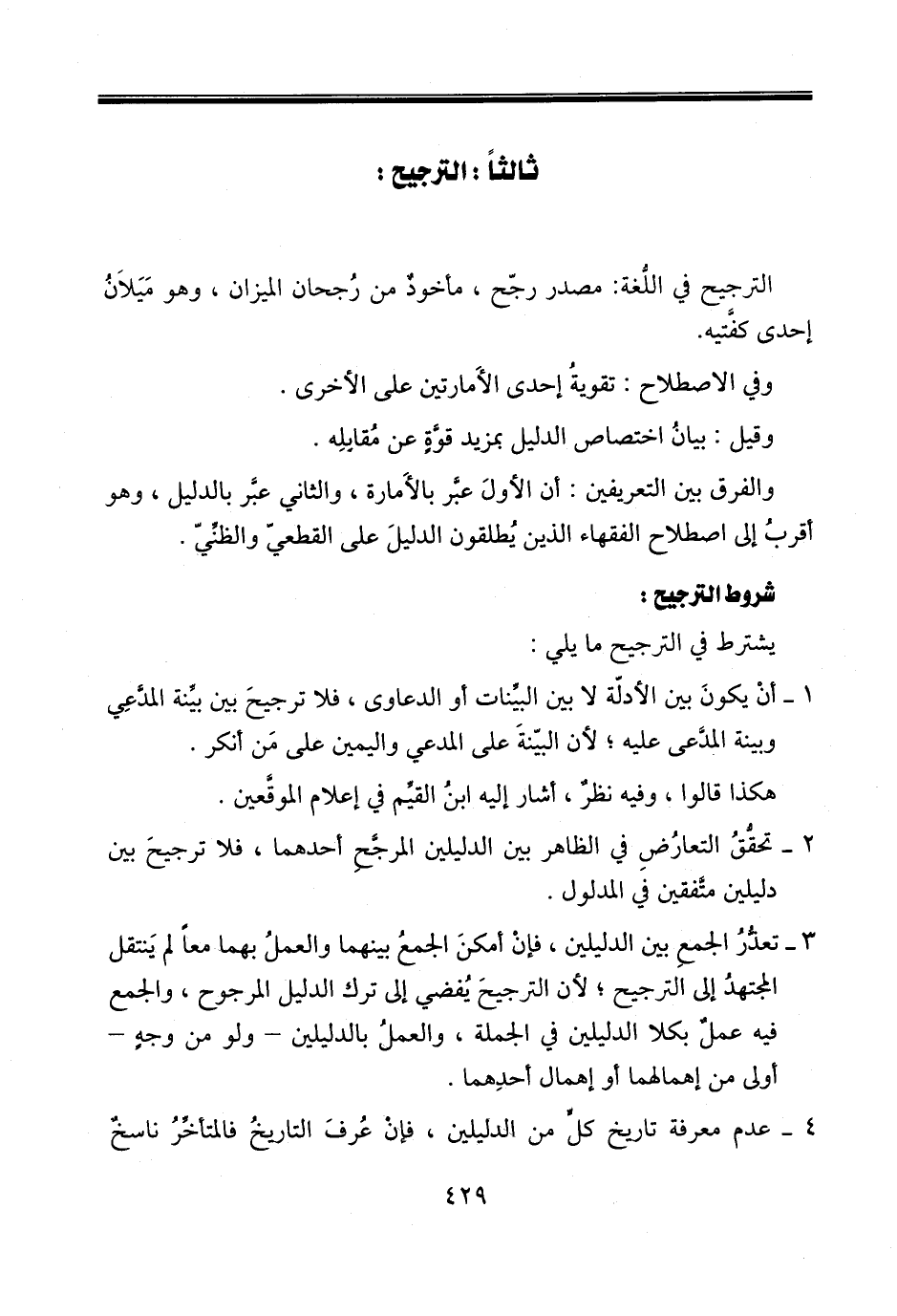1 ـ أنْ يكونَ بين الأدلّة لا بين البيِّنات أو الدعاوى، فلا ترجيحَ بين بيِّنة المدَّعِي وبينة المدَّعى عليه؛ لأن البيّنةَ على المدعي واليمين على مَن أنكر.