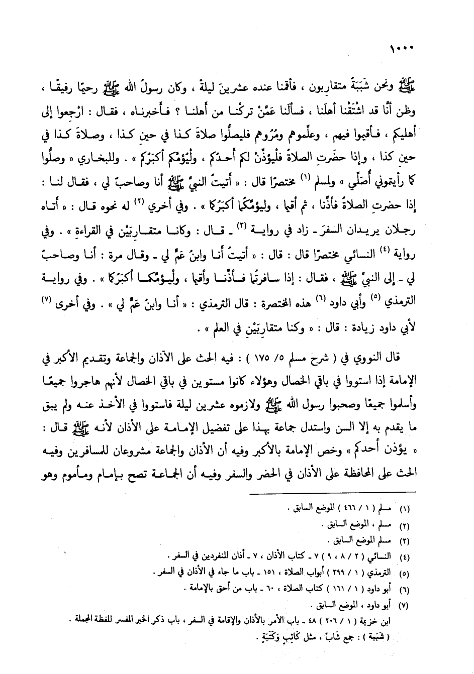 صلى الله عليه وسلم ونحن شببة متقاربون، فأقمنا عنده عشرين ليلة، وكان رسول الله صلى الله عليه وسلم رحيماً رفيقاً، وظن أنا قد اشتقنا أهلنا، فسألنا عمن تركنا من أهلنا؟ فأخبرناه، فقال: ارجعوا إلى أهليكم، فأقيموا فيهم، وعلموهم ومرهم فليصلوا صلاة كذا في حين كذا، وصلاة كذا في حين كذا، وإذا حضرت الصلاة فليؤذن لكم أحدكم، وليؤمكم أكبركم". وللبخاري "وصلوا كما رأيتموني أصلي" ولمسلم (1) مختصراً قال: "أتيت النبي صلى الله عليه وسلم أنا وصاحب لي، فقال لنا: إذا حضرت الصلاة فأذنا، ثم أقيما، وليؤمكما أكبركما". وفي أخرى (2) له نحوه قال: "أتاه رجلان يريدان السفر- زاد في رواية (3) - قال: وكانا متقاربين في القراءة". وفي رواية (4) النسائي مختصراً قال: قال: "أتيت أنا وابن عم لي- وقال مرة: أنا وصاحب لي- إلى النبي صلى الله عليه وسلم، فقال: إذا سافرتما فأذنا وأقيما، وليؤمكما أكبركما". وفي رواية الترمذي (5) وأبي داود (6) هذه المختصرة: قال الترمذي: "أنا وابن عم لي". وفي أخرى (7) لأبي داود زيادة: قال: "وكنا متقاربين في العلم".