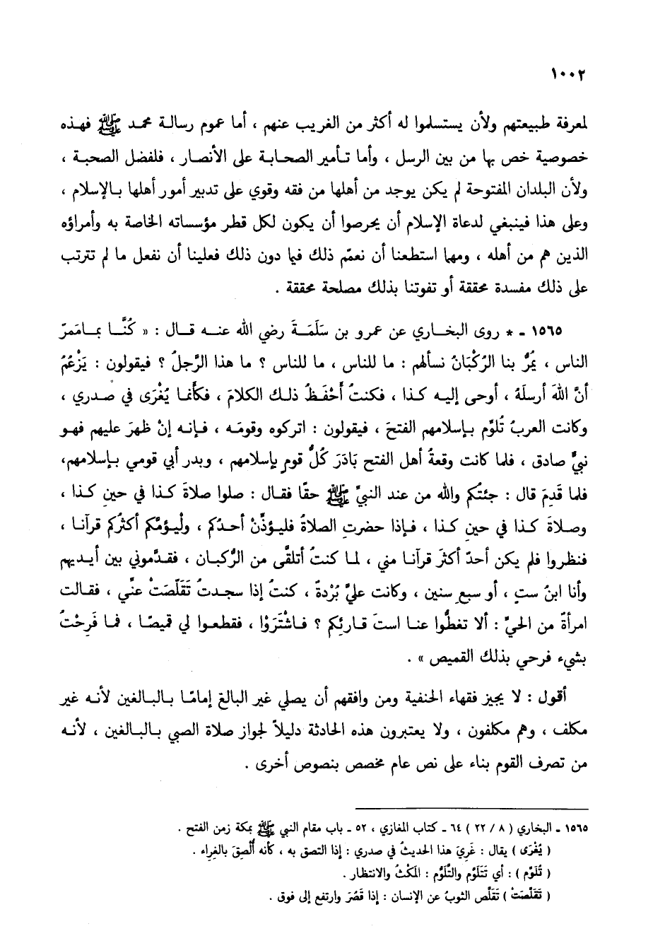 1565 - * روى البخاري عن عمرو بن سلمة رضي الله عنه قال: "كنا بما ممر الناس، يمر بنا الركبان نسألهم: ما للناس، ما للناس؟ ما هذا الرجل؟ فيقولون: يزعم أن الله أرسله، أوحى إليه كذا، فكنت أحفظ ذلك الكلام، فكأنما يغرى في صدري، وكانت العرب تلوم بإسلامهم الفتح، فيقولون: ارتكوه وقومه، فإنه إن ظهر عليهم فهو نبي صادق، فلما كانت وقعة أهل الفتح بادر كل قوم بإسلامهم، وبدر أبي قومي بإسلامهم، فلما قدم قال: جئتكم والله من عند النبي صلى الله عليه وسلم حقاً فقال: صلوا صلاة كذا في حين كذا، وصلاة كذا في حين كذا، فإذا حضرت الصلاة فليؤذن أحدكم، وليؤمكم أكثركم قرآناً، فنظروا فلم يكن أحد أكثر قرآناً مني، لما كنت أتلقى من الركبان، فقدموني بين أيديهم وأنا ابن ست، أو سبع سنين، وكانت علي بردة، كنت إذا سجدت تقلصت عني، فقالت امرأة من الحي: ألا تغطوا عنا است قارئكم؟ فاشتروا، فقطعوا لي قميصاً، فما فرحت بشيء فرحي بذلك القميص".
