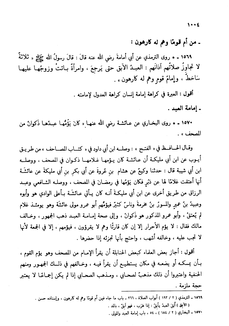 وقال الحافظ في "الفتح": وصله ابن أبي داود في "كتاب المصاحف" من طريق أيوب عن ابن أبي مليكة أن عائشة كان يؤمها غلامها ذكوان في المصحف، ووصله ابن أبي شيبة قال: حدثنا وكيع عن هشام بن عروة عن أبي بكر بن أبي مليكة عن عائشة أنها أعتقت غلاماً لها عن دبر فكان يؤمها في رمضان في المصحف، ووصله الشافعي وعبد الرزاق من طريق أخرى عن ابن أبي مليكة أنه كان يأتي عائشة بأعلى الوادي هو وأبوه وعبيد بن عمير والمسور بن مخرمة وناس كثير فيؤمهم أبو عمرو مولى عائشة وهو يومئذ غلام لم يعتق، وأبو عمرو المذكور هو ذكوان، وإلى صحة إمامة العبد ذهب الجمهور، وخالف مالك فقال: لا يؤم الأحرار إلا إن كان قارئاً وهم لا يقرؤون، فيؤمهم، إلا في الجمعة لأنها لا تجب عليه، وخالفه أشهب، واحتج بأنها تجزئه إذا حضرها.