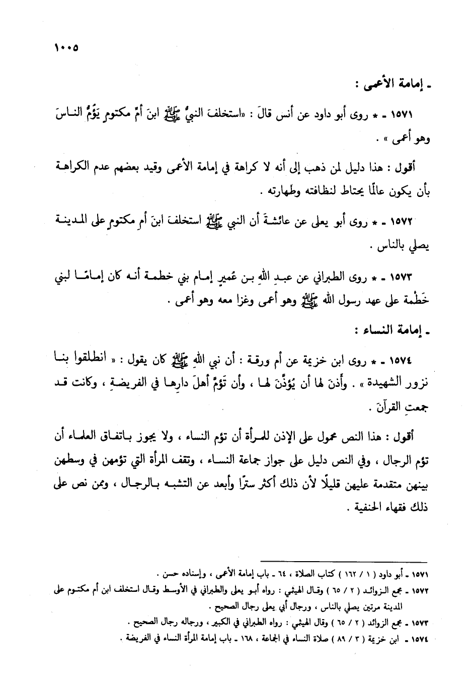 1571 - * روى أبو داود عن أنس قال: "استخلف النبي صلى الله عليه وسلم ابن أم مكتوم يؤم الناس وهو أعمى".