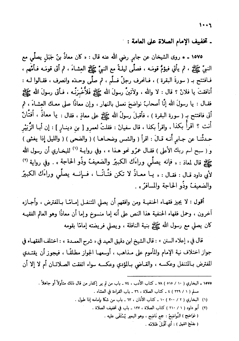 1575 - * روى الشيخان عن جابر رضي الله عنه قال: "كان معاذ بن جبل يصلي مع النبي صلى الله عليه وسلم، ثم يأتي فيؤم قومه، فصلى ليلة مع النبي صلى الله عليه وسلم العشاء، ثم أتى قومه فأمهم، فافتتح بـ (سورة البقرة)، فانحرف رجل فسلم، ثم صلى وحده وانصرف، فقالوا له: أنافقت يا فلان؟ قال: لا والله، ولآتين رسول الله صلى الله عليه وسلم فلأخبرنه، فأتى رسول الله صلى الله عليه وسلم فقال: يا رسول الله إنا أصحاب نواضح نعمل بالنهار، وإن معاذاً صلى معك العشاء، ثم أتى فافتتح بـ (سورة البقرة)، فأقبل رسول الله صلى الله عليه وسلم على معاذ، فقال: يا معاذ، أفتان أنت؟ اقرأ بكذا، واقرأ بكذا، قال سفيان: فقلت لعمرو [بن دينار]: إن أبا الزبير حدثنا عن جابر أنه قال: اقرأ (والشمس وضحاها) (والضحى) (والليل إذا يغشى) و (سبح اسم ربك الأعلى) فقال عمرو نحو هذا"، وفي رواية (2) للبخاري أن رسول الله صلى الله عليه وسلم قال لمعاذ: "فإنه يصلي وراءك الكبير والضعيف وذو الحاجة". وفي رواية (3) لأبي داود قال: فقال: "يا معاذ لا تكن فتاناً، فإنه يصلي وراءك الكبير والضعيف وذو الحاجة والمسافر".