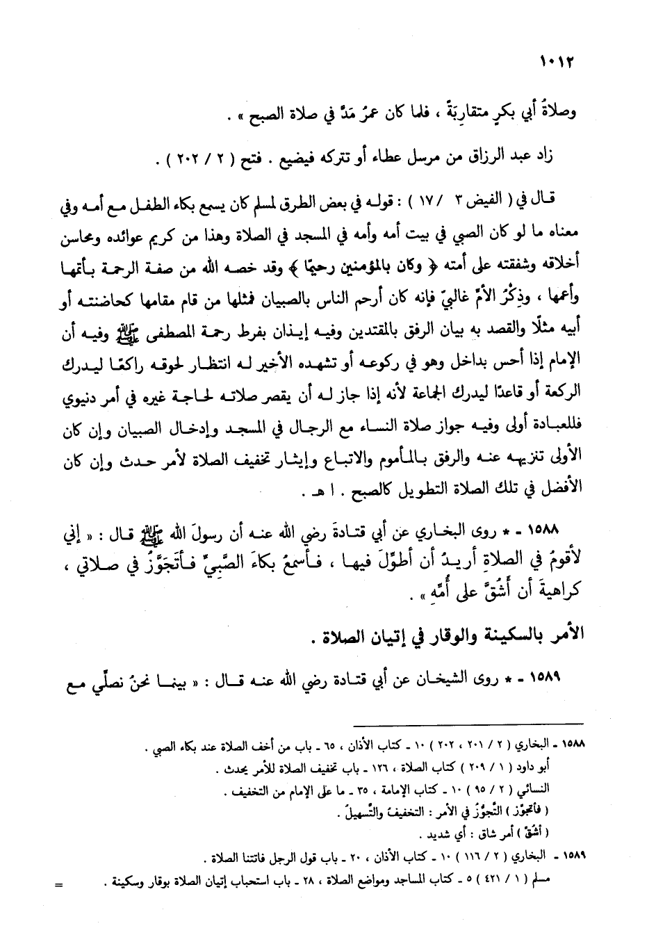 1588 - * روى البخاري عن أبي قتادة رضي الله عنه أن رسول الله صلى الله عليه وسلم قال: "إني لأقوم في الصلاة أريد أن أطول فيها، فأسمع بكاء الصبي فأتجوز في صلاتي، كراهية أن أشق على أمه".
