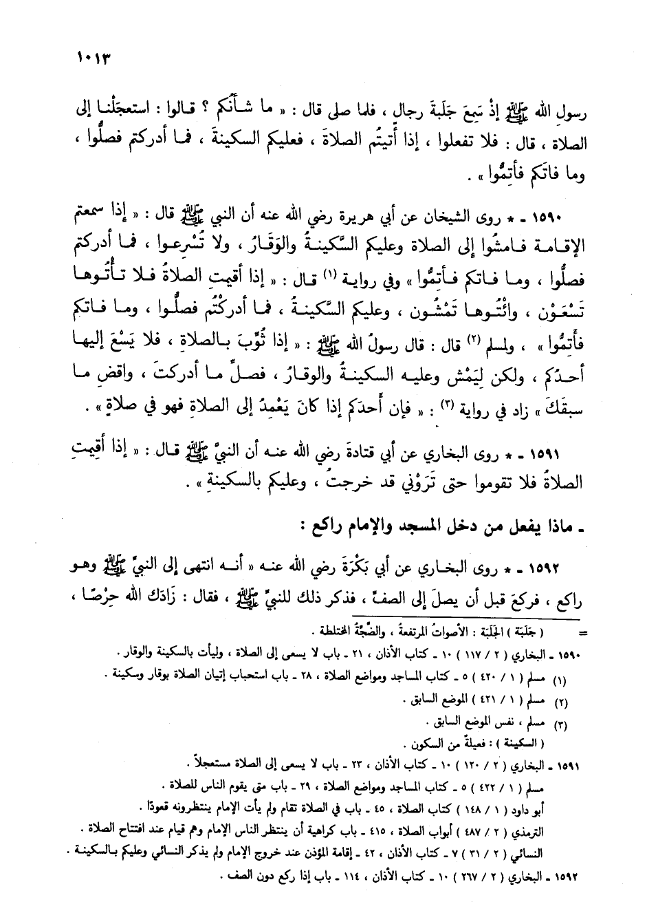 1591 - * روى البخاري عن أبي قتادة رضي الله عنه أن النبي صلى الله عليه وسلم قال: "إذا أقيمت الصلاة فلا تقوموا حتى تروني قد خرجت، وعليكم بالسكينة".