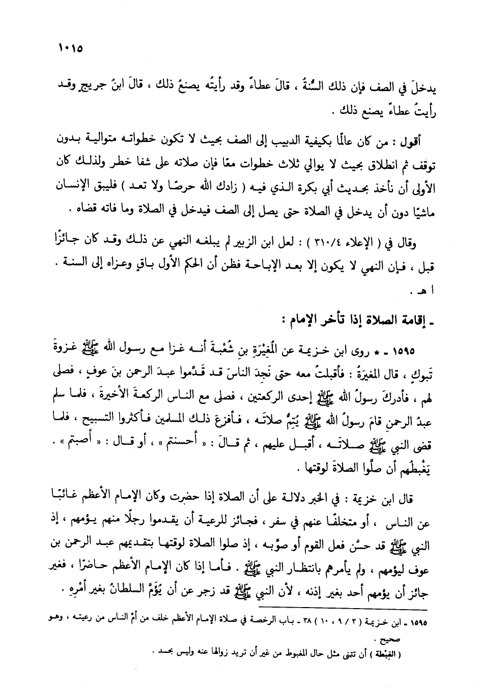 1595 - * روى ابن خزيمة عن المغيرة بن شعبة أنه غزا مع رسول الله صلى الله عليه وسلم غزوة تبوك، قال المغيرة: فأقبلت معه حتى نجد الناس قد قدموا عبد الرحمن بن عوف، فصلى لهم، فأدرك رسول الله صلى الله عليه وسلم إحدى الركعتين، فصلى مع الناس الركعة الأخيرة، فلما سلم عبد الرحمن قام رسول الله صلى الله عليه سولم يتم صلاته، فأفزع ذلك المسلمين فأكثروا التسبيح، فلما قضى النبي صلى الله عليه وسلم صلاته، أقبل عليهم، ثم قال: "أحسنتم"، أو قال: "أصبتم". يغبطهم أن صلوا الصلاة لوقتها.