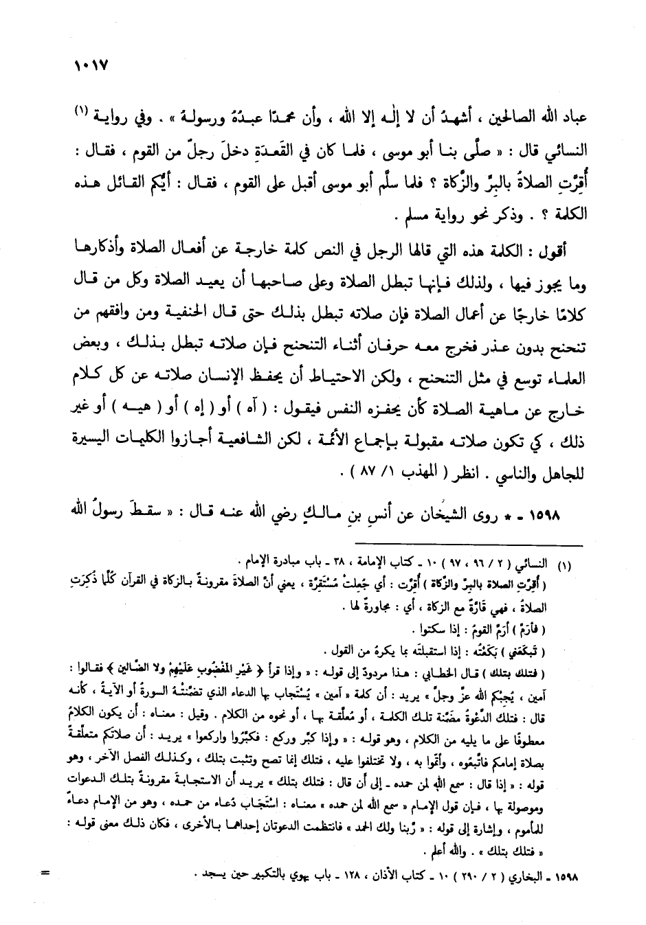 عباد الله الصالحين، أشهد أن لا إله إلا الله، وأن محمداً عبده ورسوله". وفي رواية (1) النسائي قال: "صلى بنا أبو موسى، فلما كان في القعدة دخل رجل من القوم، فقال: أقرت الصلاة بالبر والزكاة؟ فلما سلم أبو موسى أقبل على القوم، فقال: أيكم القائل هذه الكلمة؟. وذكر نحو رواية مسلم.