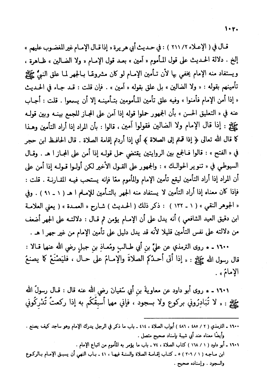 قال في (الإعلاء 2/ 211): في حديث أبي هريرة "إذا قال الإمام غير المغضوب عليهم" إلخ. دلالة الحديث على قول المأموم "آمين" بعد قول الإمام "ولا الضالين" ظاهرة، ويستفاد منه الإمام يخفي بها لأن تأمين الإمام لو كان مشروعاً بالجهر لما علق النبي صلى الله عليه وسلم تأمينهم بقوله: "ولا الضالين" بل علق بقوله "آمين". فإن قلت: قد جاء في الحديث "إذا أمن الإمام فأمنوا" وفيه علق تأمين المأمومين بتأمينه إلا أن يسمعوا. قلت: أجاب عنه في "التعليق الحسن" بأن الجمهور حملوا قوله إذا آمن على المجاز للجمع بينه وبين قوله صلى الله عليه وسلم: إذا قال الإمام ولا الضالين فقولوا آمين، قالوا: بأن المراد إذا أراد التأمين وهذا كما قال الله تعالى (إذا قمتم إلى الصلاة) أي إذا أردتم إقامة الصلاة. قال الحافظ ابن حجر في "الفتح": قالوا فالجمع بين الروايتين يقتضي حمل قوله إذا أمن على المجاز اهـ. وقال السيوطي في "تنوير الحوالك": والجمهور على القول الأخير لكن أولوا قوله إذا أمن على أن المراد إذا أراد التأمين ليقع تأمين الإمام والمأموم معاً فإنه يستحب فيه المقارنة. قلت: فإذا كان معناه إذا أراد التأمين لا يستفاد منه الجهر بالتأمين للإمام اهـ (1 - 91). وفي "الجوهر النقي" (1 - 132): ذكر ذلك (الحديث) شارح "العمدة" (يعني العلامة ابن دقيق العيد الشافعي) أنه يدل على أن الإمام يؤمن ثم قال: دلالته على الجهر أضعف من دلالته على نفس التأمين قليلاً لأنه قد يدل دليل على تأمين الإمام من غير جهر اهـ.