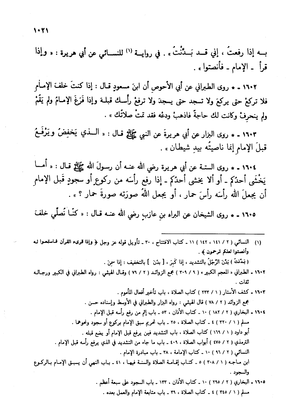 1603 - * روى البزار عن أبي هريرة عن النبي صلى الله عليه وسلم قال: "الذي يخفض ويرفع قبل الإمام إنما ناصيته بيد شيطان".