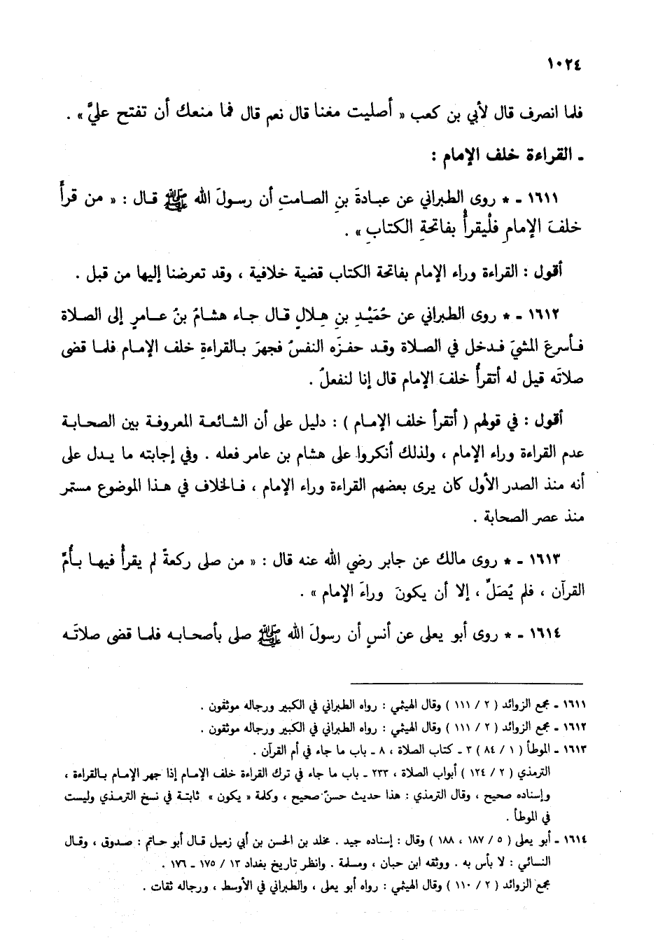 1611 - * روى الطبراني عن عبادة بن الصامت أن رسول الله صلى الله عليه وسلم قال: "من قرأ خلف الإمام فليقرأ بفاتحة الكتاب".