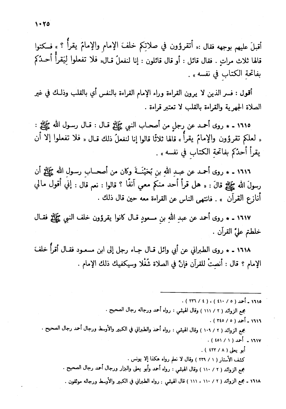 1615 - * روى أحمد عن رجل من أصحاب النبي صلى الله عليه وسلم قال: قال رسول الله صلى الله عليه وسلم: "لعلكم تقرؤون والإمام يقرأ" قالها ثلاثاً قالوا إنا لنفعل ذلك قال "فلا تفعلوا إلا أن يقرأ أحدكم بفاتحة الكتاب في نفسه".