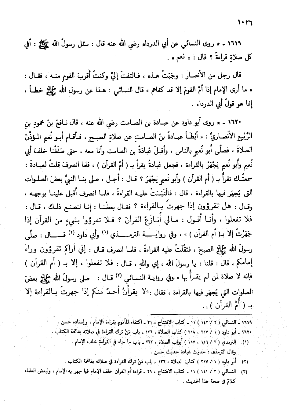 1620 - * روى أبو داود عن عبادة بن الصامت رضي الله عنه، قال نافع بن محمود بن الربيع الأنصاري: "أبطأ عبادة بن الصامت عن صلاة الصبح، فأقام أبو نعيم المؤذن الصلاة، فصلى أبو نعيم بالناس، وأقبل عبادة بن الصامت وأنا معه، حتى صففنا خلف أبي نعيم وأبو نعيم يجهر بالقراءة، فجعل عبادة يقرأ بـ (أم القرآن)، فلما انصرف قلت لعبادة: سمعتك تقرأ بـ (أم القرآن) وابو نعيم يجهر؟ قال: أجل، صلى بنا النبي بعض الصلوات التي يجهر فيها بالقراءة، قال: فالتبست عليه القراءة، فلما انصرف أقبل علينا بوجهه، وقال: هل تقرؤون إذا جهرت بالقراءة؟ فقال بعضنا: إنا لنصنع ذلك، قال: فلا تفعلوا، وأنا أقول: مالي أنازع القرآن؟ فلا تقرؤون بشيء من القرآن إذا جهرت إلا بـ (أم القرآن) "، وفي رواية الترمذي (3) وأبي داود (4) قال: صلى رسول الله صلى الله عليه وسلم الصبح، فثقلت عليه القراءة، فلما انصرف قال: إني أراكم تقرؤون وراء إمامكم، قال: قلنا: يا رسول الله، إي والله، قال: فلا تفعلوا، إلا بـ (أم القرآن) فإنه لا صلاة لمن لم يقرأ بها" وفي رواية النسائي (5) قال: صلى رسول الله صلى الله عليه وسلم بعض الصلوات التي يجهر فيها بالقراءة، فقال: "لا يقرأن أحد منكم إذا جهرت بالقراءة إلا بـ (أم القرآن) ".