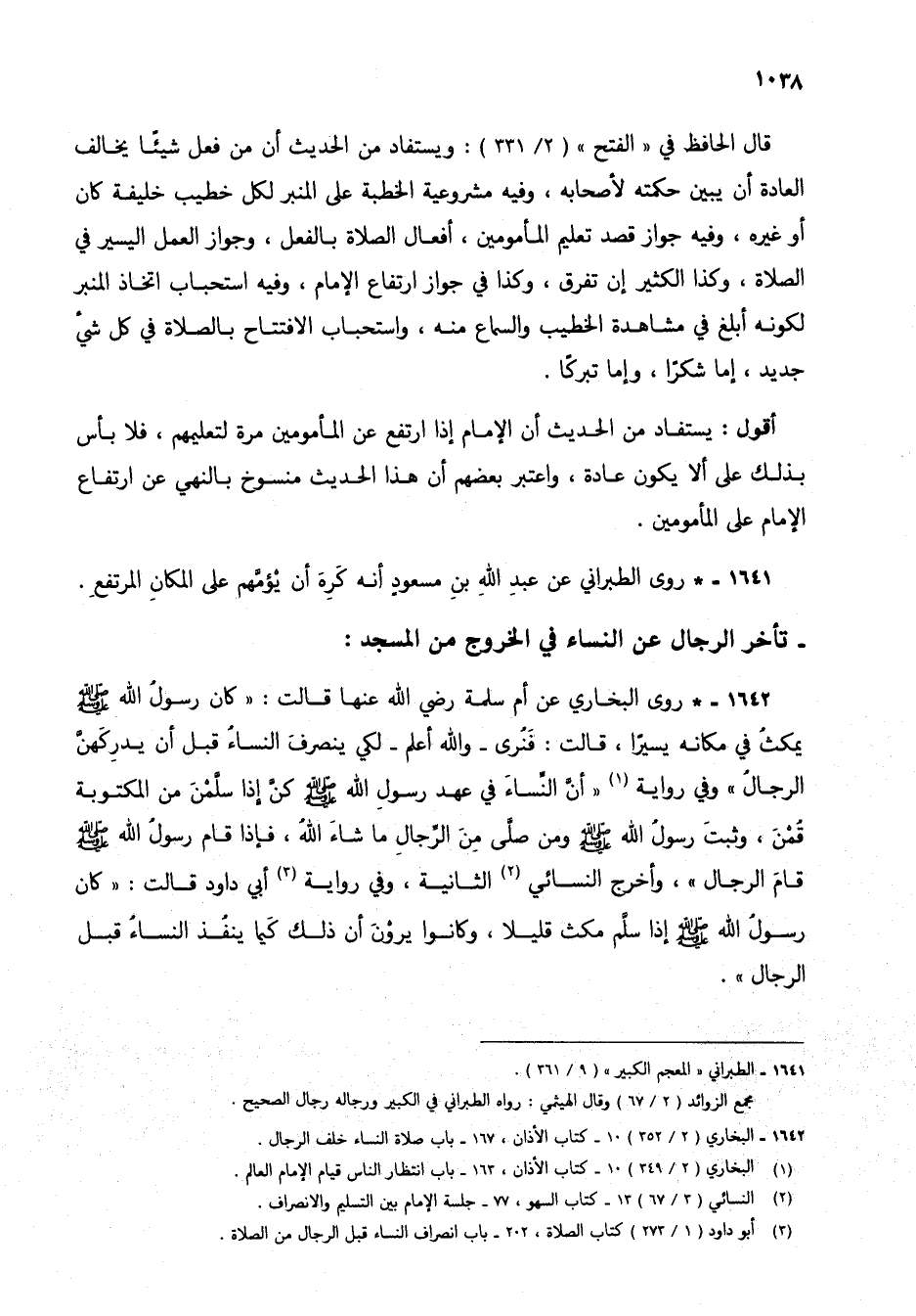 1642 - * روى البخاري عن أم سلمة رضي الله عنها قالت: "كان رسول الله صلى الله عليه وسلم يمكث في مكانه يسيراً، قالت: فنرى- والله أعلم- لكي ينصرف النساء قبل أن يدركهن الرجال" وفي رواية (3) "أن النساء في عهد رسول الله صلى الله عليه وسلم كن إذا سلمن من المكتوبة قمن، وثبت رسول الله صلى الله عليه وسلم ومن صلى من الرجال ما شاء الله، فإذا قام رسول الله صلى الله عليه وسلم قام الرجال"، وأخرج النسائي (4) الثانية، وفي رواية (5) أبي داود قالت: "كان رسول الله صلى الله عليه وسلم إذا سلم مكث قليلاً، وكانوا يرون أن ذلك كيما ينفذ النساء قبل الرجال".