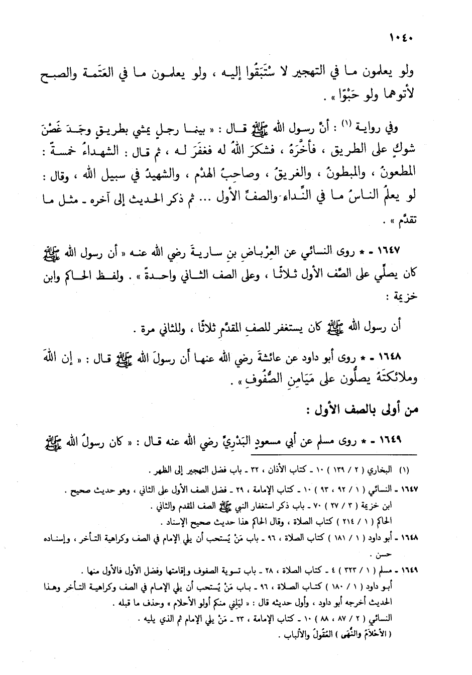 1647 - * روى النسائي عن العرباض بن سارية رضي الله عنه "أن رسول الله صلى الله عليه وسلم كان يصلي على الصف الأول ثلاثاً، وعلى الصف الثاني واحدة". ولفظ الحاكم وابن خزيمة: