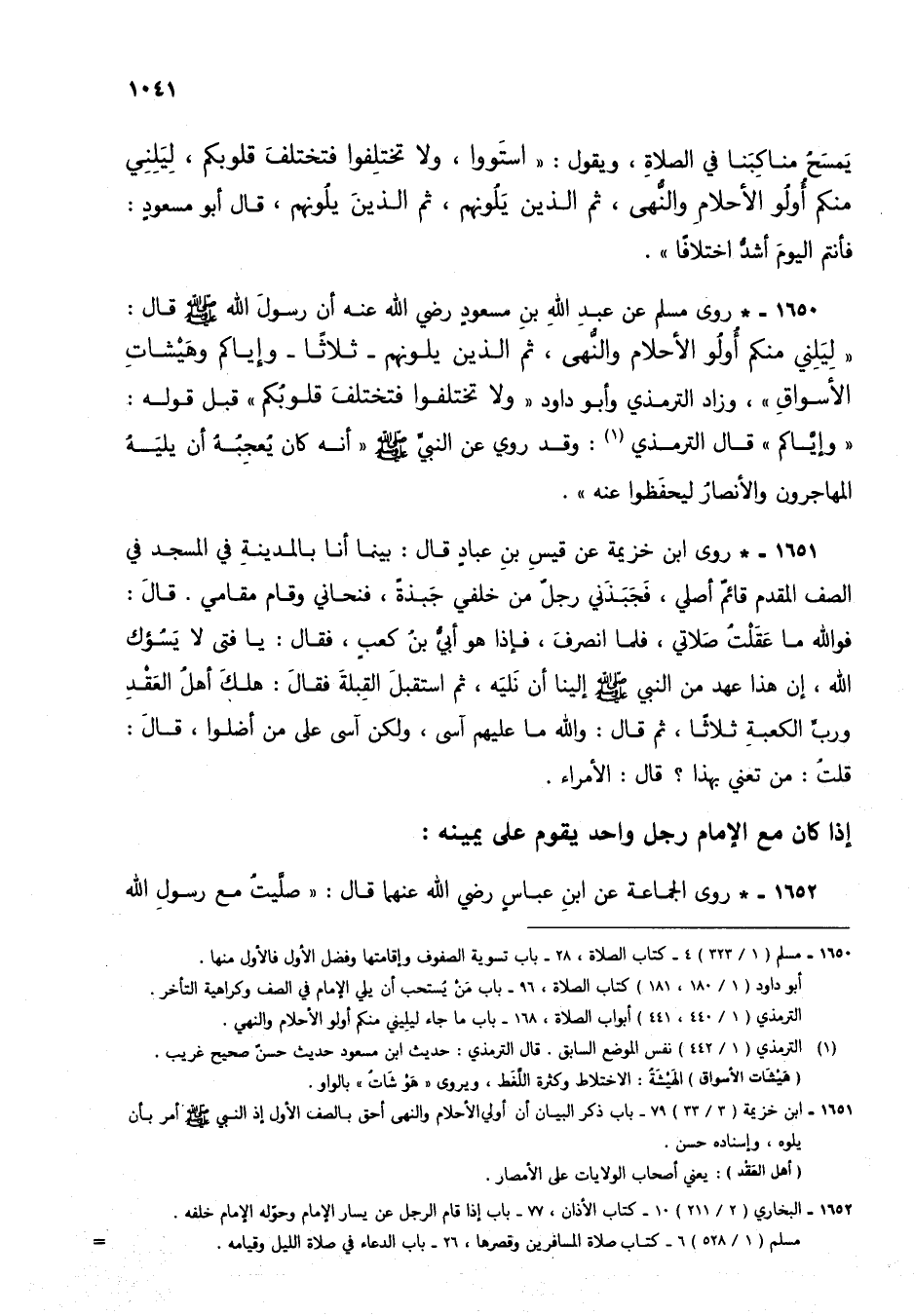 1650 - * روى مسلم عن عبد الله بن مسعود رضي الله عنه أن رسول الله صلى الله عليه وسلم قال: "ليلني منكم أولو الأحلام والنهى، ثم الذين يلونهم- ثلاثاً- وإياكم وهيشات الأسواق"، وزاد الترمذي وأبو داود "ولا تختلفوا فتختلف قلوبكم" قبل قوله: "وإياكم" قال الترمذي (2): وقد روي عن النبي صلى الله عليه وسلم "أنه كان يعجبه أن يليه المهاجرون والأنصار ليحفظوا عنه".