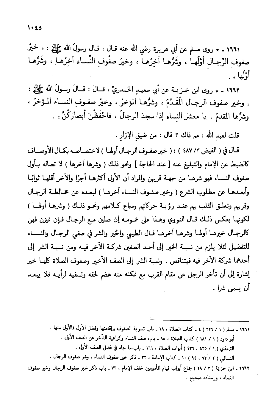 1661 - * روى مسلم عن أبي هريرة رضي الله عنه قال: قال رسول الله صلى الله عليه وسلم: "خير صفوف الرجال أولها، وشرها آخرها، وخير صفوف النساء آخرها، وشرها أولها".