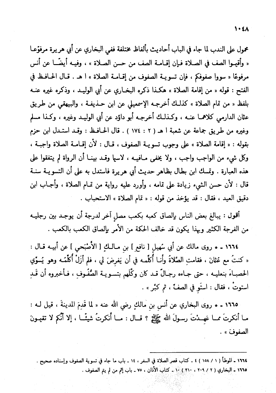 1664 - * روى مالك عن أبي سهيل [نافع] بن مالك [الأصبحي] عن أبيه قال: "كنت مع عثمان، فقامت الصلاة وأنا أكلمه في أن يفرض لي، فلم أزل أكلمه وهو يسوي الحصباء بنعليه، حتى جاءه رجال قد كان وكلهم بتسوية الصفوف، فأخبروه أن قد استوت، فقال: استو في الصف، ثم كبر".