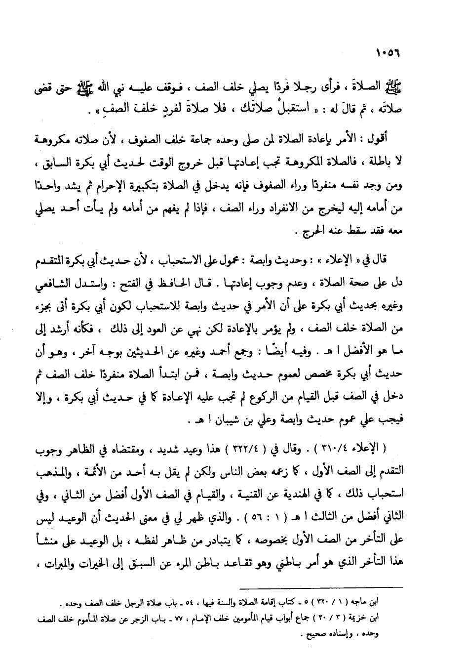 ابن ماجه (1/ 320) 5 - كتاب إقامة الصلاة والسنة فيها، 54 - باب صلاة الرجل خلف الصف وحده.