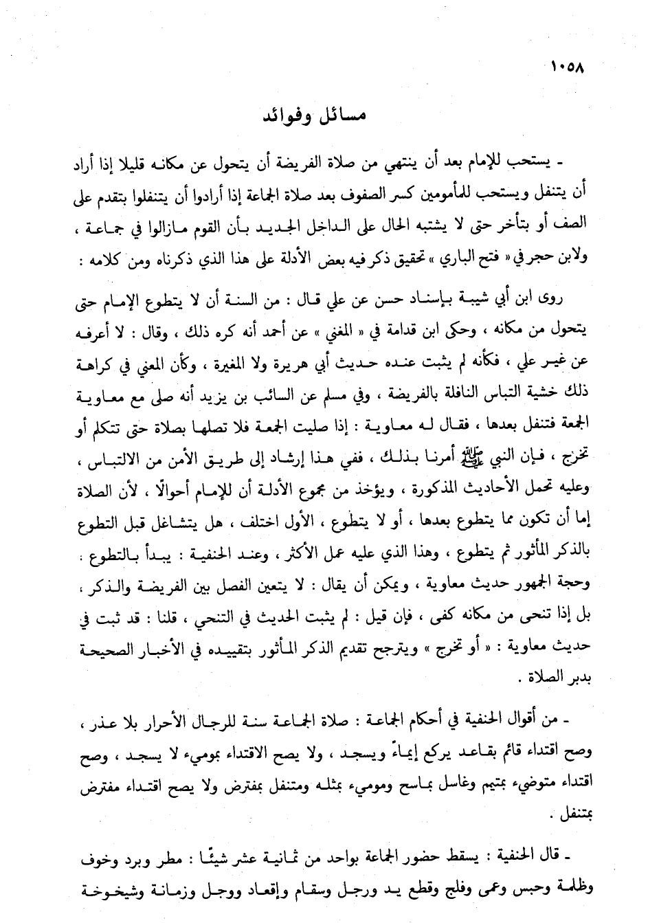 - يستحب للإمام بعد أن ينتهي من صلاة الفريضة أن يتحول عن مكانه قليلاً إذا أراد أن يتنفل ويستحب للمأمومين كسر الصفوف بعد صلاة الجماعة إذا أرادوا أن يتنفلوا بتقدم على الصف أو بتأخر حتى لا يشتبه الحال على الداخل الجديد بأن القوم ما زالوا في جماعة، ولابن حجر في "فتح الباري" تحقيق ذكر فيه بعض الأدلة على هذا الذي ذكرناه ومن كلامه: