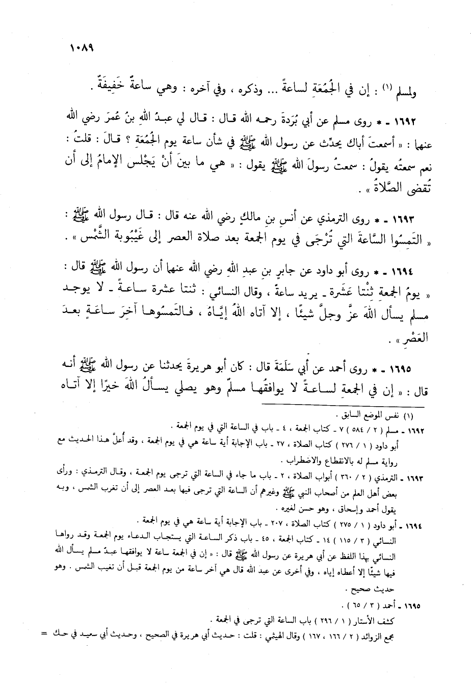 1694 - * روى أبو داود عن جابر بن عبد الله رضي الله عنهما أن رسول الله صلى الله عليه وسلم قال: "يوم الجمعة ثنتا عشرة- يريد ساعة، وقال النسائي: ثنتا عشرة ساعة- لا يوجد مسلم يسأل الله عز وجل شيئاً، إلا آتاه الله إياه، فالتمسوها آخر ساعة بعد العصر".