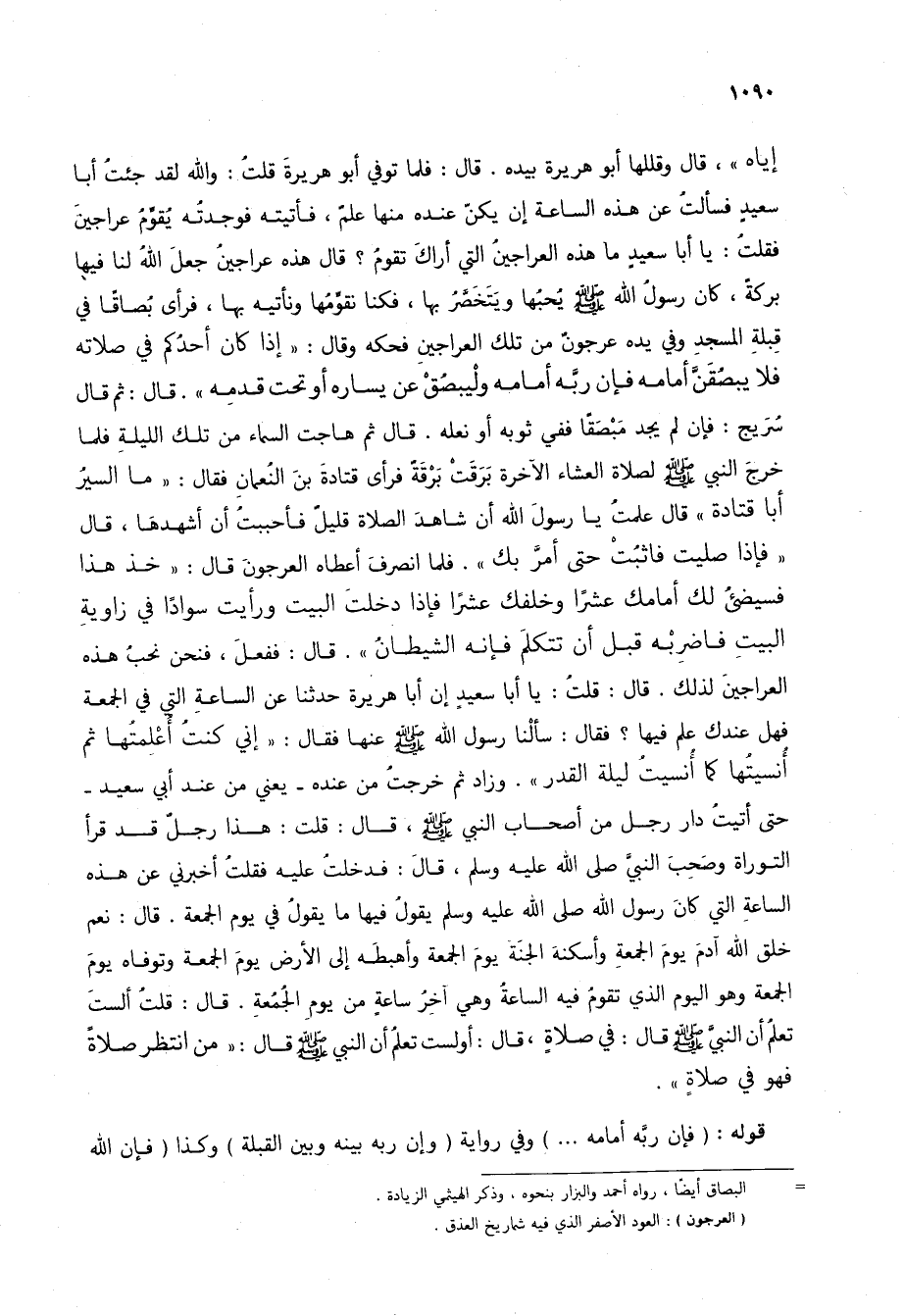 إياه"، قال وقللها أبو هريرة بيده. قال: فلما توفي أبو هريرة قلت: والله لقد جئت أبا سعيد فسألت عن هذه الساعة إن يكن عنده منها علم، فأتيته فوجدته يقوم عراجين فقلت: يا أبا سعيد ما هذه العراجين التي أراك تقوم؟ قال هذه عراجين جعل الله لنا فيها بركة، كان رسول الله صلى الله عليه وسلم يحبها ويتخصر بها، فكنا نقومها ونأتيه بها، فرأى بصاقاً في قبلة المسجد وفي يده عرجون من تلك العراجين فحكه وقال: "إذا كان أحدكم في صلاته فلا يبصقن أمامه فإن ربه أمامه وليبصق عن يساره أو تحت قدمه". قال: ثم قال سريج: فإن لم يجد مبصقاً ففي ثوبه أو نعله. قال ثم هاجت السماء من تلك الليلة فلما خرج النبي صلى الله عليه وسلم لصلاة العشاء الآخرة برقت برقة فرأى قتادة بن النعمان فقال: "ما السير أبا قتادة" قال علمت يا رسول الله أن شاهد الصلاة قليل فأحببت أن أشهدها، قال "فإذا صليت فاثبت حتى أمر بك". فلما انصرف أعطاه العرجون قال: "خذ هذا فسيضئ لك أمامك عشراً وخلفك عشراً فإذا دخلت البيت ورأيت سواداً في زاوية البيت فاضربه قبل أن تتكلم فإنه الشيطان". قال: ففعل، فنحن نحب هذه العراجين لذلك. قال: قلت: يا أبا سعيد إن أبا هريرة حدثنا عن الساعة التي في الجمعة فهل عندك علم فيها؟ فقال: سألنا رسول الله صلى الله عليه وسلم عنها فقال: "إني كنت أعلمتها ثم أنسيتها كما أنسيت ليلة القدر". وزاد ثم خرجت من عنده- يعني من عند أبي سعيد- حتى أتيت دار رجل من أصحاب النبي صلى الله عليه وسلم، قال: قلت: هذا رجل قد قرأ التوراة وصحب النبي صلى الله عليه وسلم، قال: فدخلت عليه فقلت أخبرني عن هذه الساعة التي كان رسول الله صلى الله عليه وسلم يقول فيها ما يقول في يوم الجمعة. قال: نعم خلق الله آدم يوم الجمعة وأسكنه الجنة يوم الجمعة وأهبطه إلى الأرض يوم الجمعة وتوفاه يوم الجمعة وهو اليوم الذي تقوم فيه الساعة وهي آخر ساعة من يوم الجمعة. قال: قلت ألست تعلم أن النبي صلى الله عليه وسلم قال: في صلاة، قال: أولست تعلم أن النبي صلى الله عليه وسلم قال: "من انتظر صلاة فهو في صلاة".