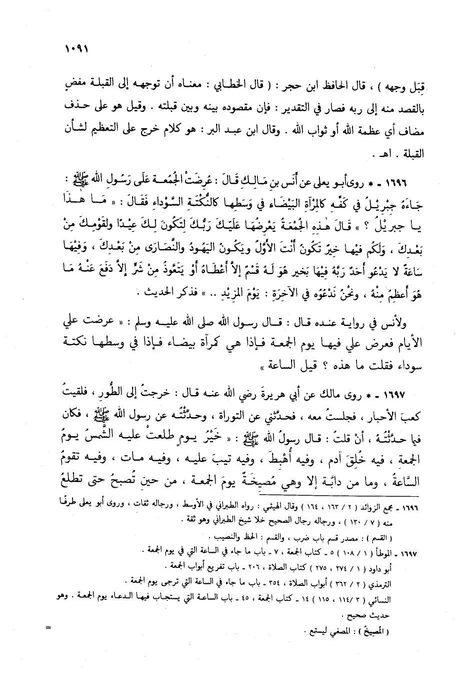1696 - * روى أبو يعلى عن أنس بن مالك قال: عرضت الجمعة على رسول الله صلى الله عليه وسلم: جاءه جبريل في كفه كالمرآة البيضاء في وسطها كالنكتة السوداء فقال: "ما هذا يا جبريل؟ " قال هذه الجمعة يعرضها عليك ربك لتكون لك عيداً ولقومك من بعدك، ولكم فيها خير تكون أنت الأول ويكون اليهود والنصارى من بعدك، وفيها ساعة لا يدعو أحد ربه فيها بخير هو له قسم إلا أعطاه أو يتعوذ من شر إلا دفع عنه ما هو أعظم منه، ونحن ندعوه في الآخرة: يوم المزيد .. " فذكر الحديث.