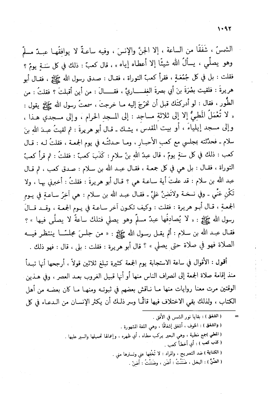 الشمس، شفقاً من الساعة، إلا الجن والإنس، وفيه ساعة لا يوافقها عبد مسلم وهو يصلي، يسأل الله شيئاً إلا أعطاه إياه"، قال كعب: ذلك في كل سنة يوم؟ فقلت: بل في كل جمعة، فقرأ كعب التوراة، فقال: صدق رسول الله صلى الله عليه وسلم، فقال أبو هريرة: فلقيت بصرة بن أبي بصرة الغفاري، فقال: من أين أقبلت؟ فقلت: من الطور، فقال: لو أدركتك قبل أن تخرج إليه ما خرجت، سمعت رسول الله صلى الله عليه وسلم يقول: "لا تعمل المطي إلا إلى ثلاثة مساجد: إلى المسجد الحرام، وإلى مسجدي هذا، وإلى مسجد إيلياء، أو بيت المقدس" يشك- قال أبو هريرة: ثم لقيت عبد الله بن سلام- فحدثته بمجلسي مع كعب الأحبار، وما حدثته في يوم الجمعة، فقلت له: قال كعب: ذلك في كل سنة يوم، قال عبد الله بن سلام: كذب كعب: فقلت: ثم قرأ كعب التوراة، فقال: بل هي في كل جمعة، فقال عبد الله بن سلام: صدق كعب، ثم قال عبد الله بن سلام: قد علمت أية ساعة هي؟ قال أبو هريرة: فقلت: أخبرني بها، ولا تكن عني- وفي نسخة ولا تضن علي- فقال عبد الله بن سلام: هي آخر ساعة في يوم الجمعة، قال أبو هريرة: فقلت: وكيف تكون آخر ساعة في يوم الجمعة، وقد قال رسول الله صلى الله عليه وسلم: "لا يصادفها عبد مسلم وهو يصلي فتلك ساعة لا يصلى فيها"؟ فقال عبد الله بن سلام: ألم يقل رسول الله صلى الله عليه وسلم: "من جلس مجلساً ينتظر فيه الصلاة فهو في صلاة حتى يصلي"؟ قال أبو هريرة: فقلت: بلى، قال: فهو ذلك.
