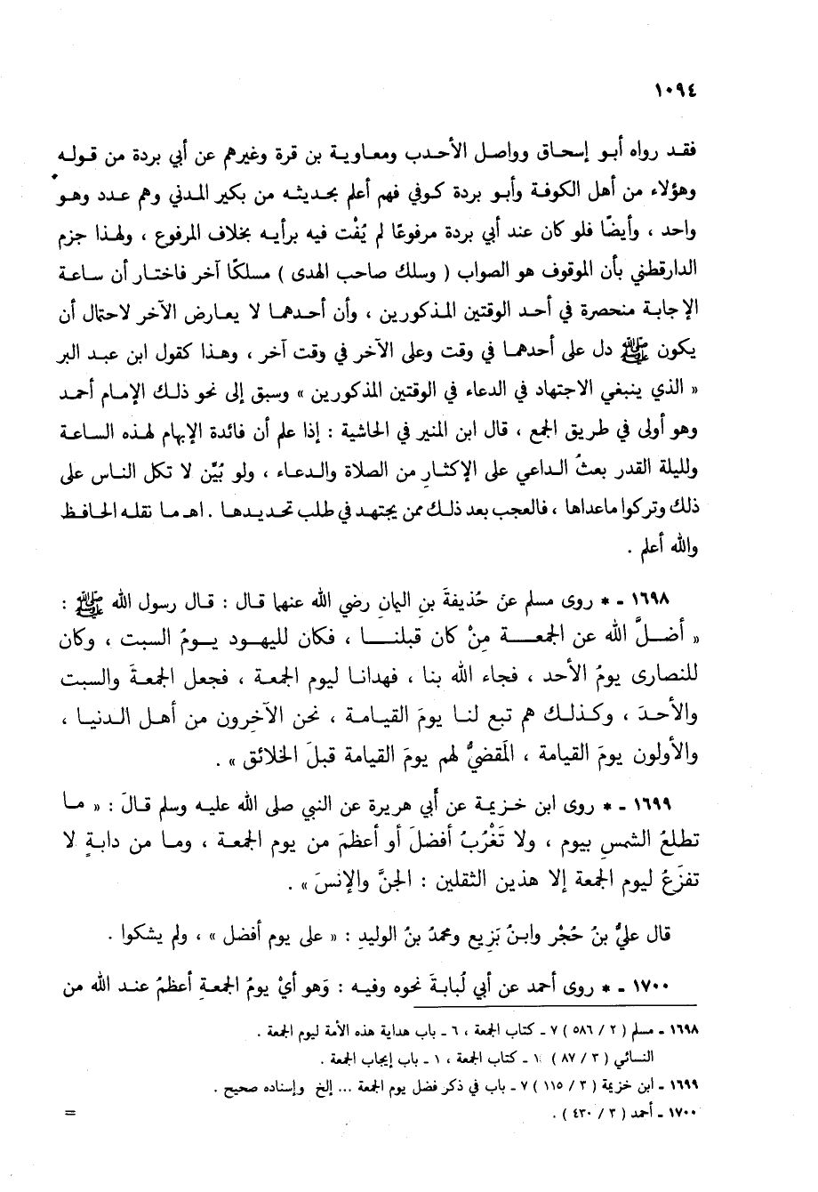 فقد رواه أبو إسحاق وواصل الأحدب ومعاوية بن قرة وغيرهم عن أبي بردة من قوله وهؤلاء من أهل الكوفة وأبو بردة كوفي فهم أعلم بحديثه من بكير المدني وهم عدد وهو واحد، وأيضاً فلو كان عند أبي بردة مرفوعاً لم يفت فيه برأيه بخلاف المرفوع، ولهذا جزم الدارقطني بأن الموقوف هو الصواب (وسلك صاحب الهدى) مسلكاً آخر فاختار أن ساعة الإجابة منحصرة في أحد الوقتين المذكورين، وأن أحدهما لا يعارض الآخر لاحتمال أن يكون صلى الله عليه وسلم دل على أحدهما في وقت وعلى الآخر في وقت آخر، وهذا كقول ابن عبد البر "الذي ينبغي الاجتهاد في الدعاء في الوقتين المذكورين" وسبق إلى نحو ذلك الإمام أحمد وهو أولى في طريق الجمع، قال ابن المنير في الحاشية: إذا علم أن فائدة الإبهام لهذه الساعة ولليلة القدر بعث الداعي على الإكثار من الصلاة والدعاء، ولو بين لا تكل الناس على ذلك وتركوا ما عداها، فالعجب بعد ذلك ممن يجتهد في طلب تحديدها. اهـ ما نقله الحافظ والله أعلم.