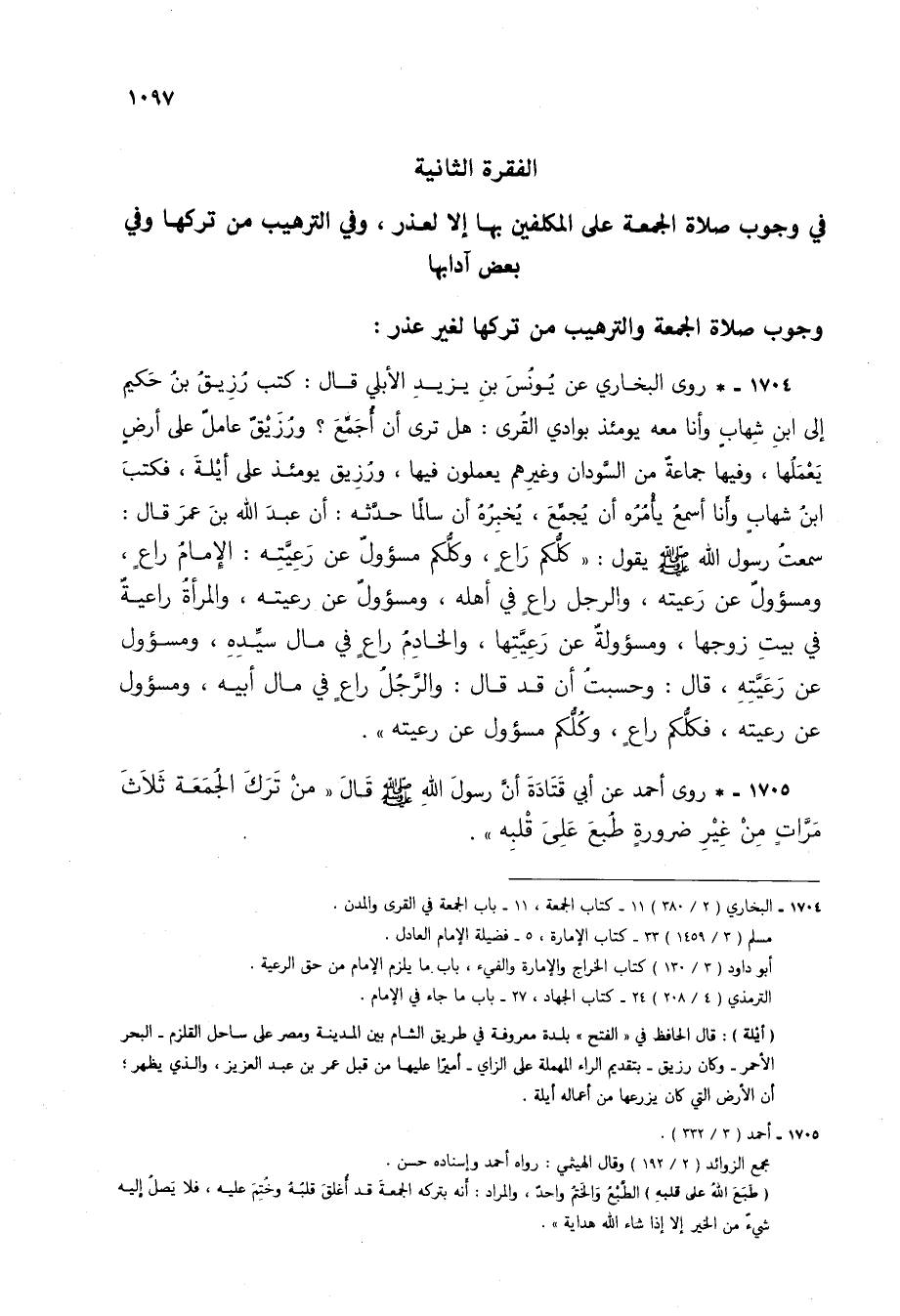 1704 - * روى البخاري عن يونس بن يزيد الأبلي قال: كتب رزيق بن حكيم إلى ابن شهاب وأنا معه يومئذ بوادي القرى: هل ترى أن أجمع؟ ورزيق عامل على أرض يعملها، وفيها جماعة من السودان وغيرهم يعملون فيها، ورزيق يومئذ على أيلة، فكتب ابن شهاب وأنا أسمع يأمره أن يجمع، يخبره أن سالماً حدثه: أن عبد الله بن عمر قال: سمعت رسول الله صلى الله عليه وسلم يقول: "كلكم راع، وكلكم مسؤول عن رعيته: الإمام راع، ومسؤول عن رعيته، والرجل راع في أهله، ومسؤول عن رعيته، والمرأة راعية في بيت زوجها، ومسؤولة عن رعيتها، والخادم راع في مال سيده، ومسؤول عن رعيته، قال: وحسبت أن قد قال: والرجل راع في مال أبيه، ومسؤول عن رعيته، فكلكم راع، وكلكم مسؤول عن رعيته".