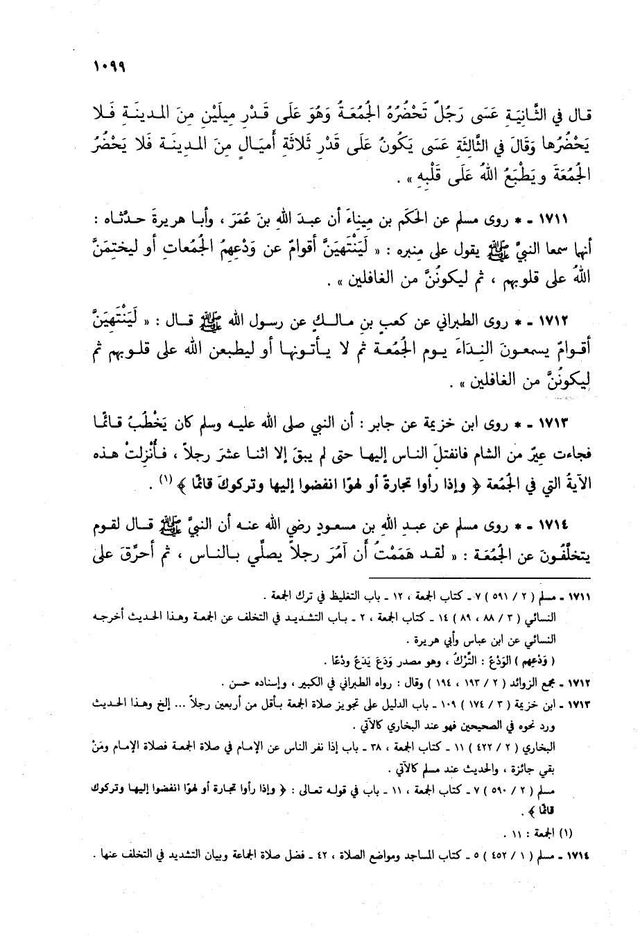 1711 - * روى مسلم عن الحكم بن ميناء أن عبد الله بن عمر، وأبا هريرة حدثاه: أنهما سمعا النبي صلى الله عليه وسلم يقول على منبره: "لينتهين أقوام عن ودعهم الجمعات أو ليختمن الله على قلوبهم، ثم ليكونن من الغافلين".