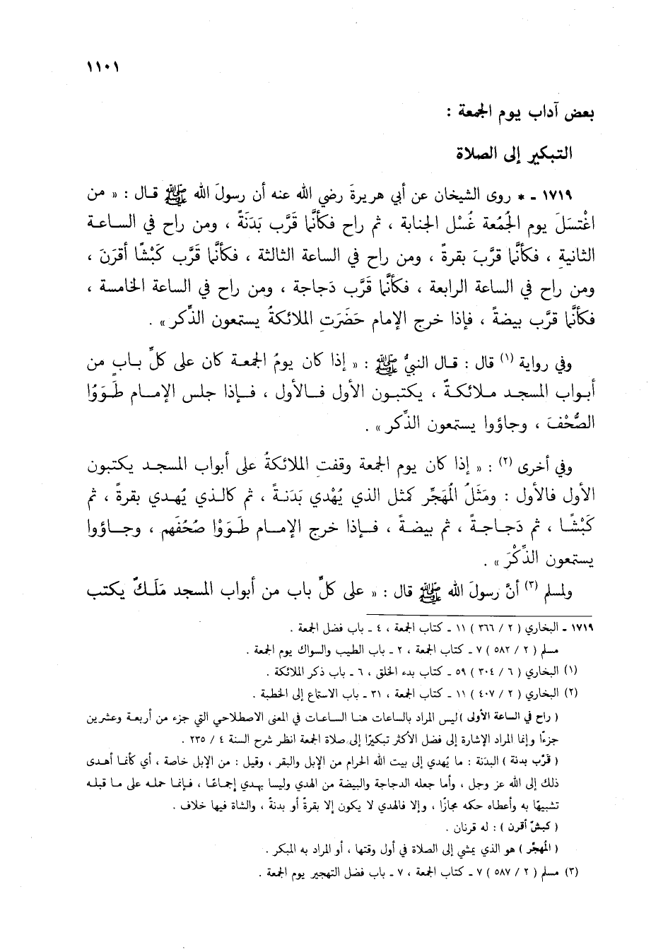 1719 - * روى الشيخان عن أبي هريرة رضي الله عنه أن رسول الله صلى الله عليه وسلم قال: "من اغتسل يوم الجمعة غسل الجنابة، ثم راح فكأنما قرب بدنة، ومن راح في الساعة الثانية، فكأنما قرب بقرة، ومن راح في الساعة الثالثة، فكأنما قرب كبشاً أقرن، ومن راح في الساعة الرابعة، فكأنما قرب دجاجة، ومن راح في الساعة الخامسة، فكأنما قرب بيضة، فإذا خرج الإمام حضرت الملائكة يستمعون الذكر".