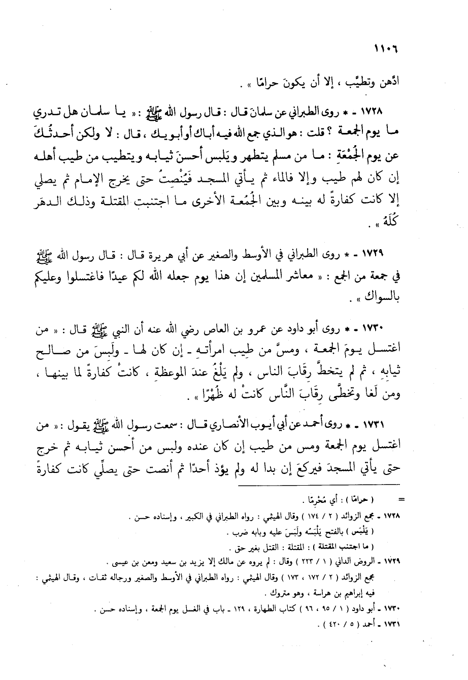 1730 - * روى أبو داود عن عمرو بن العاص رضي الله عنه أن النبي صلى الله عليه وسلم قال: "من اغتسل يوم الجمعة، ومس من طيب امرأته- إن كان لها- ولبس من صالح ثيابه، ثم لم يتخط رقاب الناس، ولم يلغ عند الموعظة، كانت كفارة لما بينها، ومن لغا وتخطى رقاب الناس كانت له ظهراً".