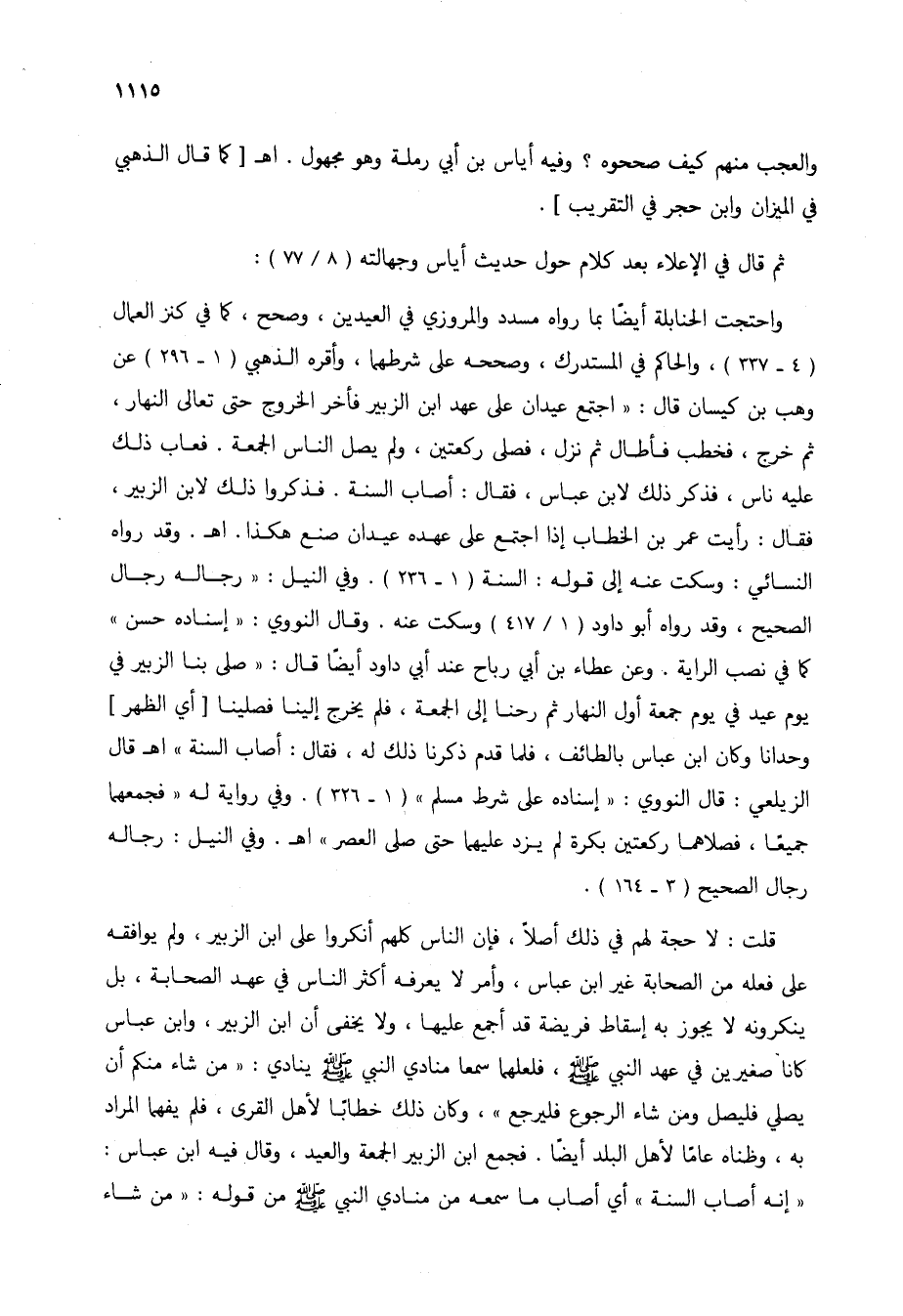 واحتجت الحنابلة أيضاً بما رواه مسدد والمروزي في العيدين، وصحح، كما في كنز العمال (4 - 337)، والحاكم في المستدرك، وصححه على شرطهما، وأقره الذهبي (1 - 296) عن وهب بن كيسان قال: "اجتمع عيدان على عهد ابن الزبير فأخر الخروج حتى تعالى النهار، ثم خرج، فخطب فأطال ثم نزل، فصلى ركعتين، ولم يصل الناس الجمعة. فعاب ذلك عليه ناس، فذكر ذلك لابن عباس، فقال: أصاب السنة. فذكروا ذلك لابن الزبير، فقال: رأيت عمر بن الخطاب إذا اجتمع على عهده عيدان صنع هكذا. اهـ. وقد رواه النسائي: وسكت عنه إلى قوله: السنة (1 - 236). وفي النيل: "رجاله رجال الصحيح، وقد رواه أبو داود (1/ 417) وسكت عنه. وقال النووي: "إسناده حسن" كما في نصب الراية. وعن عطاء بن أبي رباح عند أبي داود أيضاً قال: "صلى بنا الزبير في يوم عيد في يوم جمعة أول النهار ثم رحنا إلى الجمعة، فلم يخرج إلينا فصلينا [أي الظهر] وحدانا وكان ابن عباس بالطائف، فلما قدم ذكرنا ذلك له، فقال: أصاب السنة" اهـ قال الزيلعي: قال النووي: "إسناده على شرط مسلم" (1 - 326). وفي رواية له "فجمعهما جميعاً، فصلاهما ركعتين بكرة لم يزد عليهما حتى صلى العصر" اهـ. وفي النيل: رجاله رجال الصحيح (3 - 164).