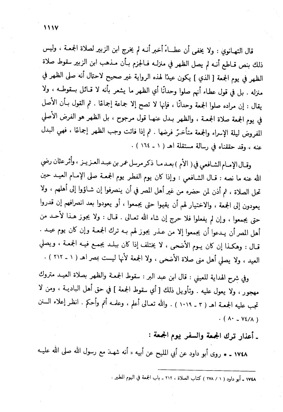 قال التهانوي: ولا يخفى أن عطاء أخبر أنه لم يخرج ابن الزبير لصلاة الجمعة، وليس ذلك بنص قاطع أنه لم يصل الظهر في منزله فالجزم بأن مذهب ابن الزبير سقوط صلاة الظهر في يوم الجمعة [الذي] يكون عيداً لهذه الرواية غير صحيح لاحتمال أنه صلى الظهر في منزله. بل في قول عطاء أنهم صلوا وحداناً أي الظهر ما يشعر بأنه لا قائل بسقوطه، ولا يقال: إن مراده صلوا الجمعة وحداناً، فإنها لا تصح إلا جماعة إجماعاً. ثم القول بأن الأصل في يوم الجمعة صلاة الجمعة، والظهر بدل عنها قول مرجوح، بل الظهر هو الفرض الأصلي المفروض ليلة الإسراء والجمعة متأخر فرضها. ثم إذا فاتت وجب الظهر إجماعاً، فهي البدل عنه، وقد حققناه في رسالة مستقلة اهـ (1 - 164).