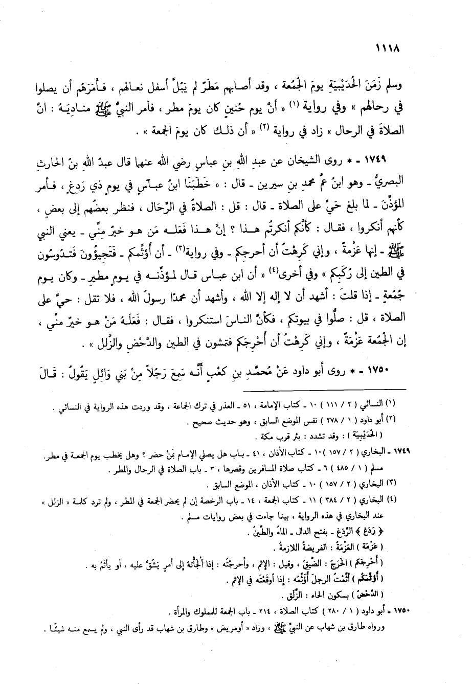 1749 - * روى الشيخان عن عبد الله بن عباس رضي الله عنهما قال عبد الله بن الحارث البصري- وهو ابن عم محمد بن سيرين- قال: "خطبنا ابن عباس في يوم ذي ردغ، فأمر المؤذن- لما بلغ حي على الصلاة- قال: قل: الصلاة في الرحال، فنظر بعضهم إلى بعض، كأنهم أنكروا، فقال: كأنكم أنكرتم هذا؟ إن هذا فعله من هو خير مني- يعني النبي صلى الله عليه وسلم- إنها عزمة، وإني كرهت أن أحرجكم- وفي رواية (3) - أن أؤثمكم- فتجيؤون فتدوسون في الطين إلى ركبكم" وفي أخرى (4) "أن ابن عباس قال لمؤذنه في يوم مطير- وكان يوم جمعة- إذا قلت: أشهد أن لا إله إلا الله، وأشهد أن محمداً رسول الله، فلا تقل: حي على الصلاة، قل: صلوا في بيوتكم، فكأن الناس استنكروا، فقال: فعله من هو خير مني، إن الجمعة عزمة، وإني كرهت أن أحرجكم فتمشون في الطين والدحض والزلل".