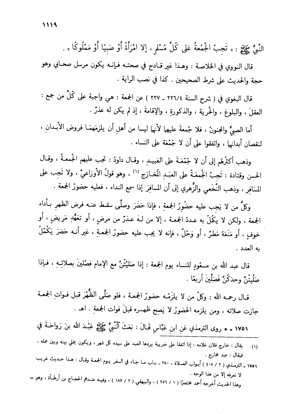 النبي صلى الله عليه وسلم: "تجب الجمعة على كل مسلم، إلا امرأة أو صبياً أو مملوكاً".