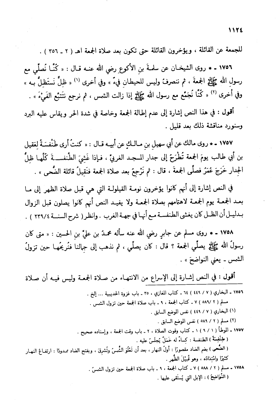 1756 - * روى الشيخان عن سلمة بن الأكوع رضي الله عنه قال: "كنا نصلي مع رسول الله صلى الله عليه وسلم الجمعة، ثم ننصرف وليس للحيطان فيء" وفي أخرى (1) "ظل نستظل به" وفي أخرى (2) "كنا نجمع مع رسول الله صلى الله عليه وسلم إذا زالت الشمس، ثم نرجع نتتبع الفيء".