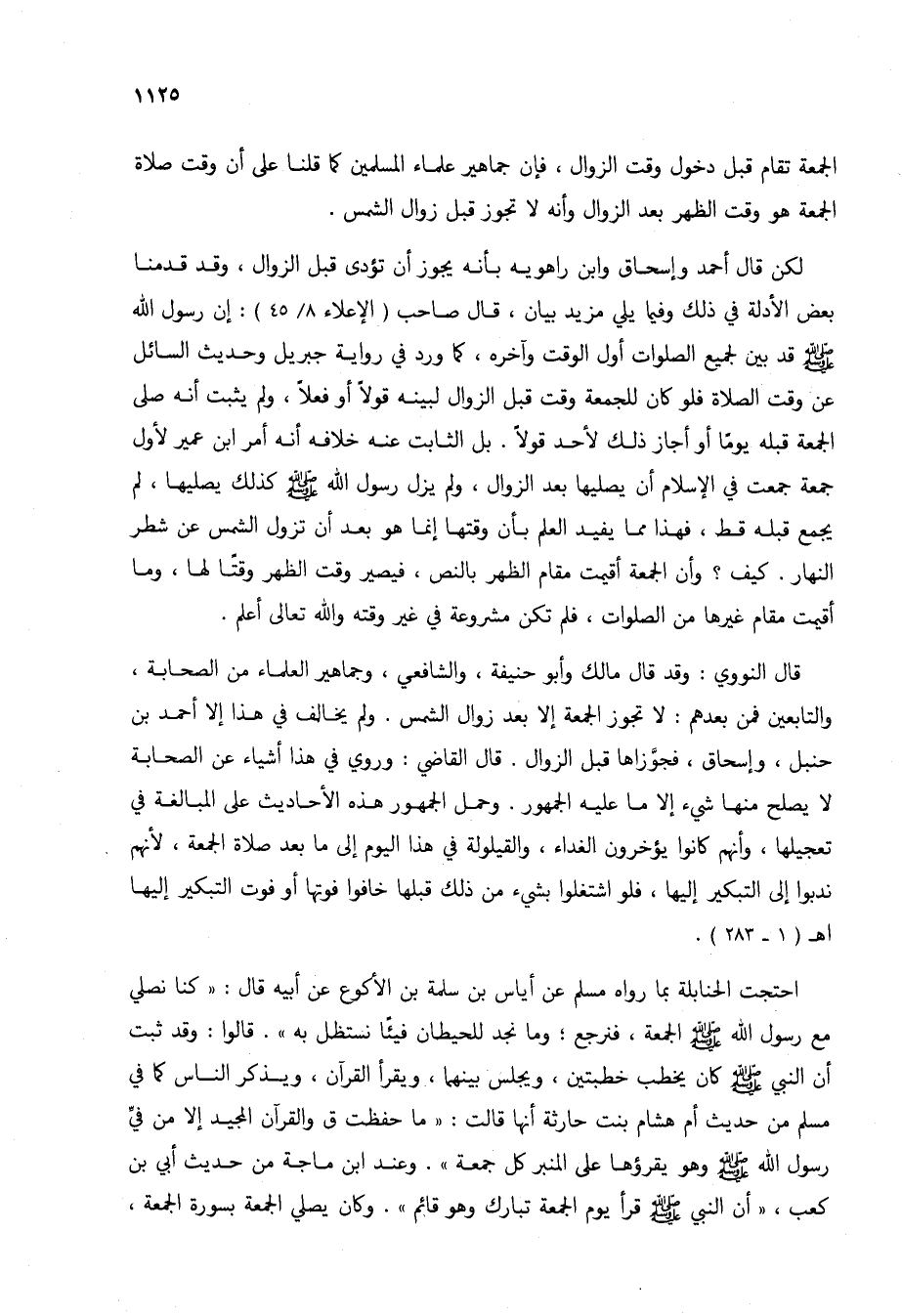 لكن قال أحمد وإسحاق وابن راهويه بأنه يجوز أن تؤدى قبل الزوال، وقد قدمنا بعض الأدلة في ذلك وفيما يلي مزيد بيان، قال صاحب (الإعلاء 8/ 45): إن رسول الله صلى الله عليه وسلم قد بين لجميع الصلوات أول الوقت وآخره، كما ورد في رواية جبريل وحديث السائل عن وقت الصلاة فلو كان للجمعة وقت قبل الزوال لبينه قولاً أو فعلاً، ولم يثبت أنه صلى الجمعة قبله يوماً أو أجاز ذلك لأحد قولاً. بل الثابت عنه خلافه أنه أمر ابن عمير لأول جمعة جمعت في الإسلام أن يصليها بعد الزوال، ولم يزل رسول الله صلى الله عليه وسلم كذلك يصليها، لم يجمع قبله قط، فهذا مما يفيد العلم بأن وقتها إنما هو بعد أن تزول الشمس عن شطر النهار. كيف؟ وأن الجمعة أقيمت مقام الظهر بالنص، فيصير وقت الظهر وقتاً لها، وما أقيمت مقام غيرها من الصلوات، فلم تكن مشروعة في غير وقته والله تعالى أعلم.