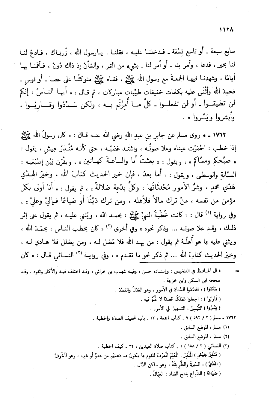 1762 - * روى مسلم عن جابر بن عبد الله رضي الله عنه قال: "كان رسول الله صلى الله عليه وسلم إذا خطب: احمرت عيناه وعلا صوته، واشتد غضبه، حتى كأنه منذر جيش، يقول: "صبحكم ومساكم"، ويقول: "بعثت أنا والساعة كهاتين"، ويقرن بين إصبعيه: السبابة والوسطى، ويقول: "أما بعد، فإن خير الحديث كتاب الله، وخير الهدي هدي محمد، وشر الأمور محدثاتها، وكل بدعة ضلالة"، ثم يقول: "أنا أولى بكل مؤمن من نفسه، من ترك مالاً فلأهله، ومن ترك ديناً أو ضياعاً فإلي وعلي"، وفي رواية (1) قال: "كانت خطبة النبي صلى الله عليه وسلم: يحمد الله، ويثني عليه، ثم يقول على إثر ذلك، وقد علا صوته ... وذكر نحوه" وفي أخرى (2) "كان يخطب الناس: يحمد الله، ويثني عليه بما هو أهله ثم يقول: من يهد الله فلا مضل له، ومن يضلل فلا هادي له، وخير الحديث كتاب الله ... ثم ذكر نحو ما تقدم"، وفي رواية (3) النسائي قال: "كان