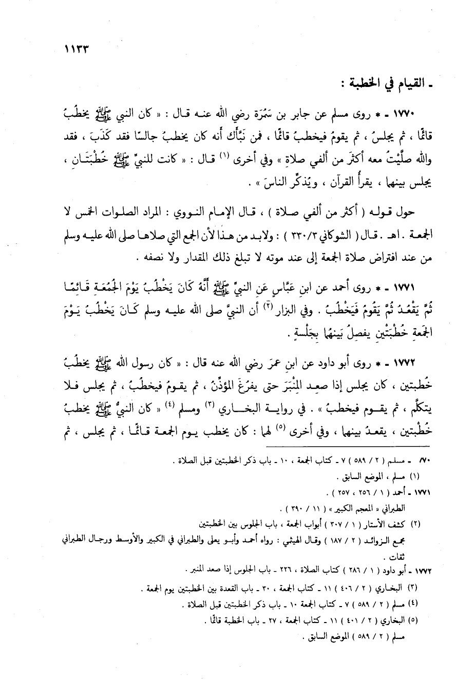 1770 - * روى مسلم عن جابر بن سمرة رضي الله عنه قال: "كان النبي صلى الله عليه وسلم يخطب قائماً، ثم يجلس، ثم يقوم فيخطب قائماً، فمن نبأك أنه كان يخطب جالساً فقد كذب، فقد والله صليت معه أكثر من ألفي صلاة" وفي أخرى (1) قال: "كانت للنبي صلى الله عليه وسلم خطبتان، يجلس بينهما، يقرأ القرآن، ويذكر الناس".