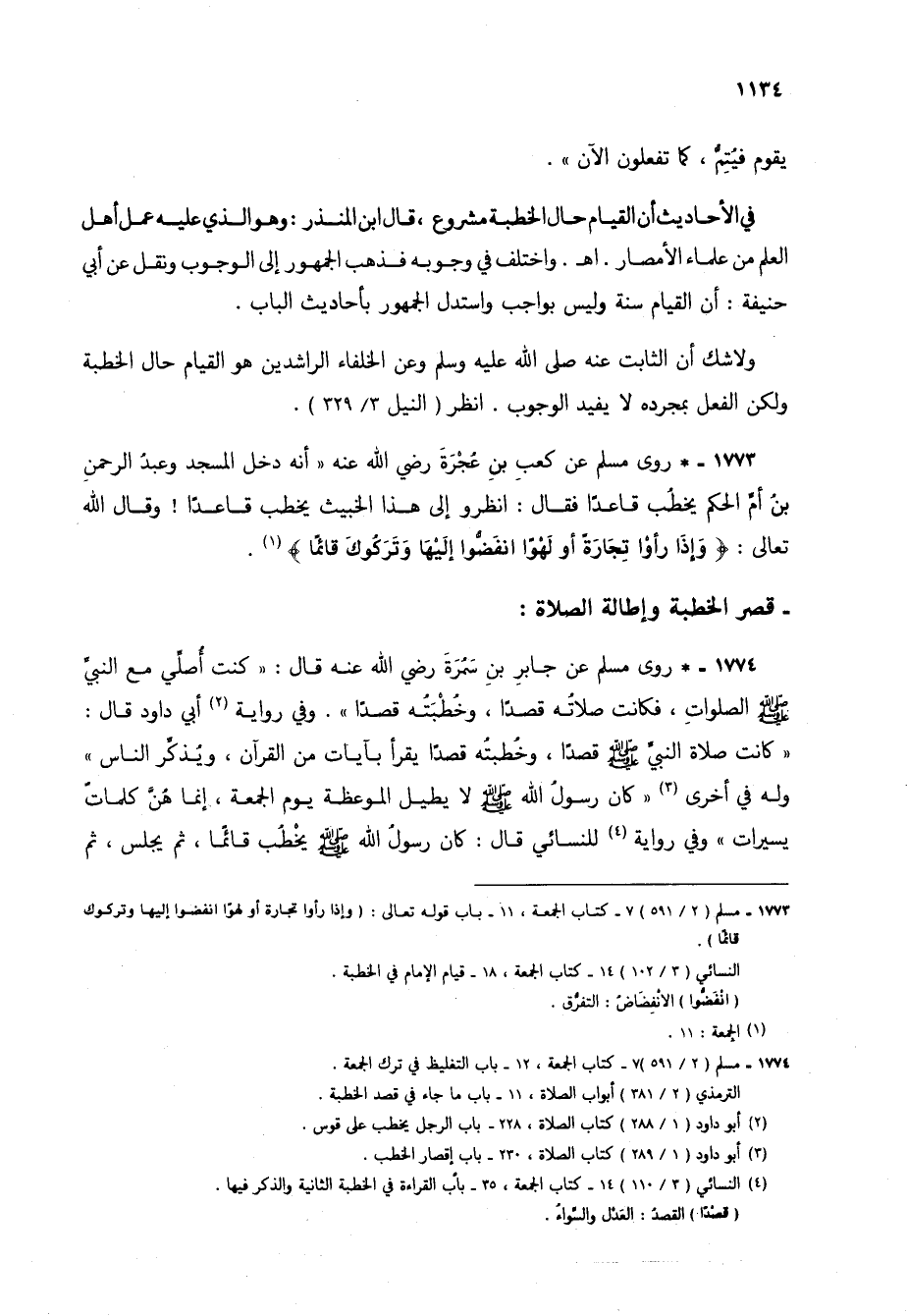1774 - * روى مسلم عن جابر بن سمرة رضي الله عنه قال: "كنت أصلي مع النبي صلى الله عليه وسلم الصلوات، فكانت صلاته قصداً، وخطبته قصداً". وفي رواية (2) أبي داود قال: "كانت صلاة النبي صلى الله عليه وسلم قصداً، وخطبته قصداً يقرأ بآيات من القرآن، ويذكر الناس" وله في أخرى (3) "كان رسول الله صلى الله عليه وسلم لا يطيل الموعظة يوم الجمعة، إنما هن كلمات يسيرات" وفي رواية (4) للنسائي قال: كان رسول الله صلى الله عليه وسلم يخطب قائماً، ثم يجلس، ثم
