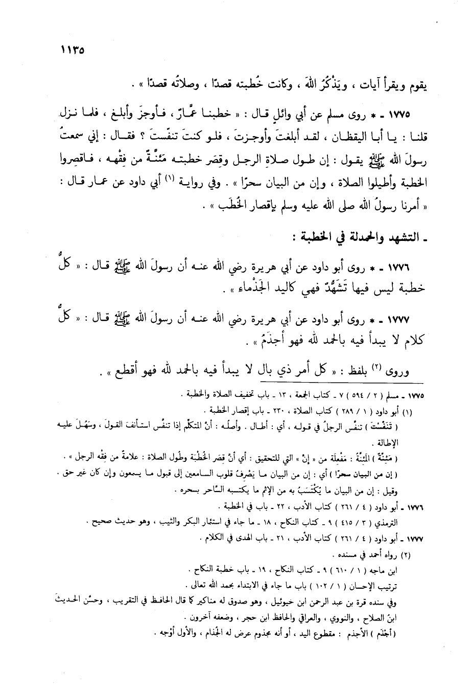 1776 - * روى أبو داود عن أبي هريرة رضي الله عنه أن رسول الله صلى الله عليه وسلم قال: "كل خطبة ليس فيها تشهد فهي كاليد الجذماء".