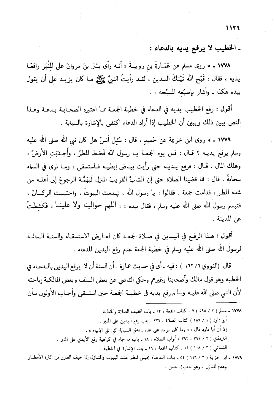 أقول: هذا الرفع في اليدين في صلاة الجمعة كان لعارض الاستسقاء والسنة الدائمة لرسول الله صلى الله عليه وسلم في خطبة الجمعة عدم رفع اليدين للدعاء.