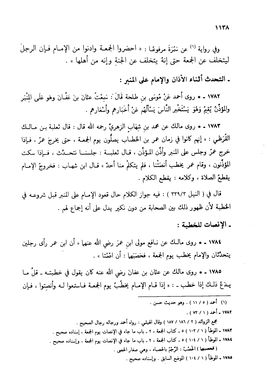 1784 - * روى مالك عن نافع مولى ابن عمر رضي الله عنهما "أن ابن عمر رأى رجلين يتحدثان والإمام يخطب يوم الجمعة، فحصبهما: أن اصمتا".