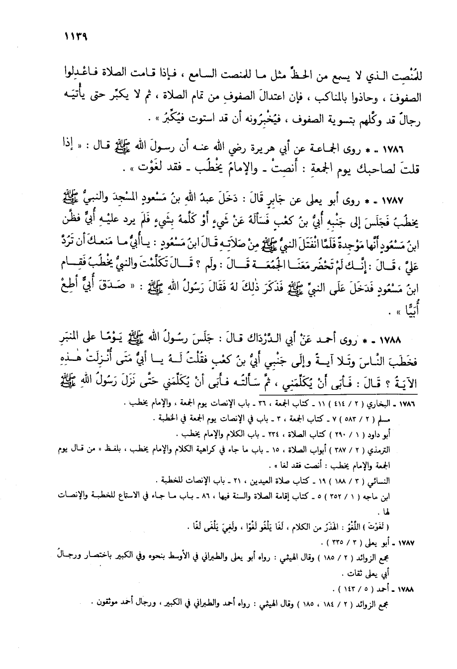 1786 - * روى الجماعة عن أبي هريرة رضي الله عنه أن رسول الله صلى الله عليه وسلم قال: "إذا قلت لصاحبك يوم الجمعة: أنصت- والإمام يخطب- فقد لغوت".