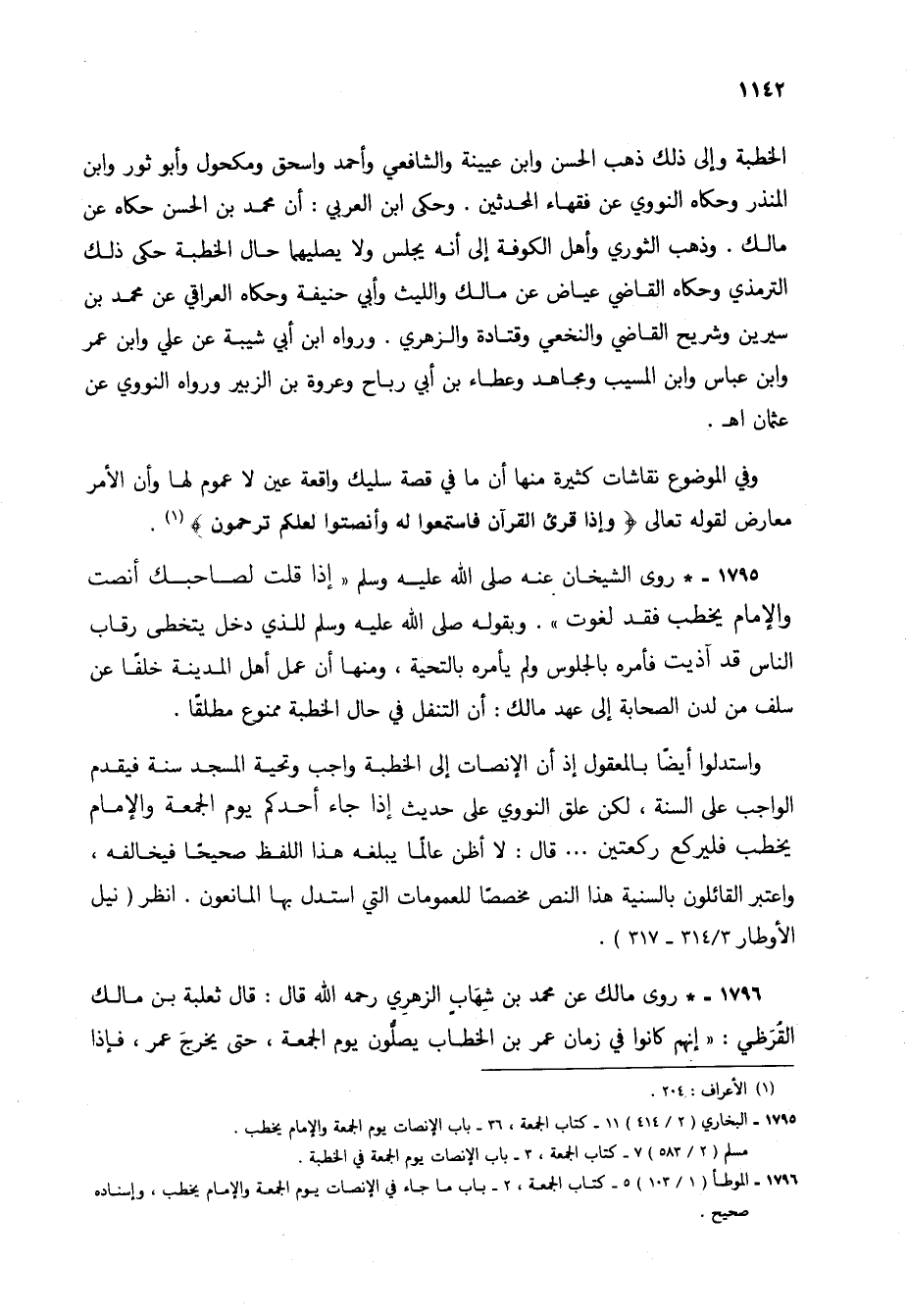 1795 - * روى الشيخان عنه صلى الله عليه وسلم "إذا قلت لصاحبك أنصت والإمام يخطب فقد لغوت". وبقوله صلى الله عليه وسلم للذي دخل يتخطى رقاب الناس قد آذيت فأمره بالجلوس ولم يأمره بالتحية، ومنها أن عمل أهل المدينة خلفاً عن سلف من لدن الصحابة إلى عهد مالك: أن التنفل في حال الخطبة ممنوع مطلقاً.