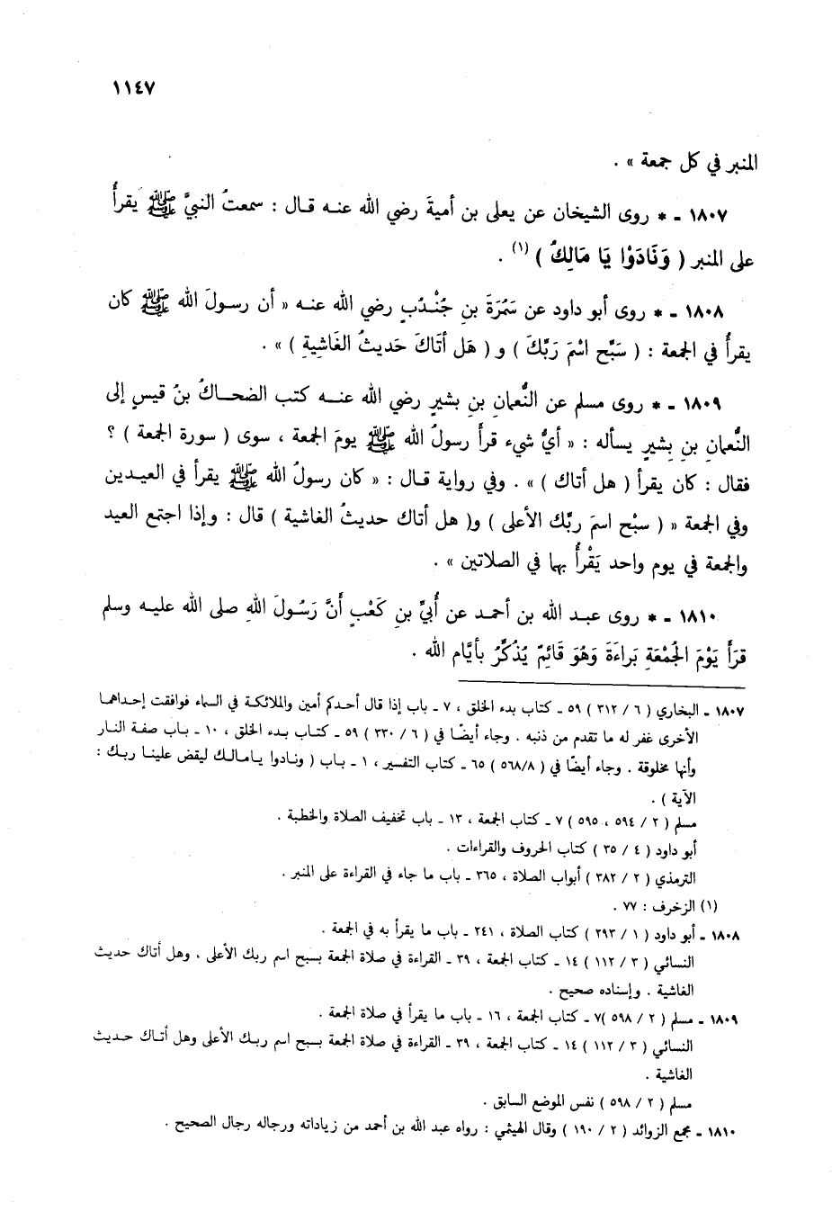 1809 - * روى مسلم عن النعمان بن بشير رضي الله عنه كتب الضحاك بن قيس إلى النعمان بن بشير يسأله: "أي شيء قرأ رسول الله صلى الله عليه وسلم يوم الجمعة، سوى (سورة الجمعة)؟ فقال: كان يقرأ (هل أتاك) ". وفي رواية قال: "كان رسول الله صلى الله عليه وسلم يقرأ في العيدين وفي الجمعة: {سَبِّحِ اسْمَ رَبِّكَ الْأَعْلَى} و {هَلْ أَتَاكَ حَدِيثُ الْغَاشِيَةِ} قال: وإذا اجتمع العيد والجمعة في يوم واحد يقرأ بهما في الصلاتين".
